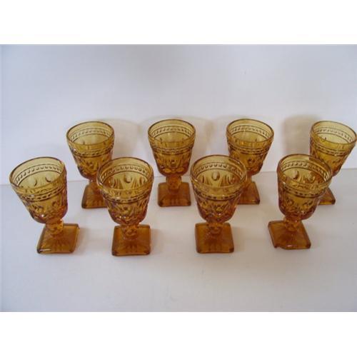 Here is a wonderful lot of 8 INDIANA COLONY AMBER PARK LANE Cordials. Some call them shot glass. Everyone seems to call them something different. They are 3.5 inches tall and 2 inches in diameter. This lot is as close to mint as you can get except for one glass with a chip on the base of the stem. It is shown in the picture. I can not find a chip or crack anywhere on the others. This pattern is retired from 1950's. THOSE WERE THE DAYS!!!! I acquired them from an Estate Auction. What a Charming addition to your Holiday table on in the China Cabinet for all to see!