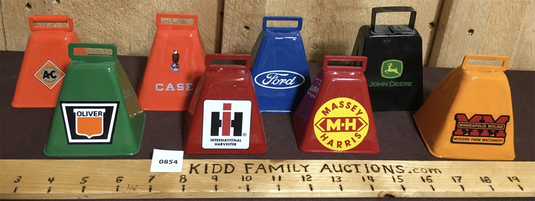 LOT OF 8 - ADVERTISNG COW BELLS - CASE, OLIVER, IH, FORD, JD, ETC