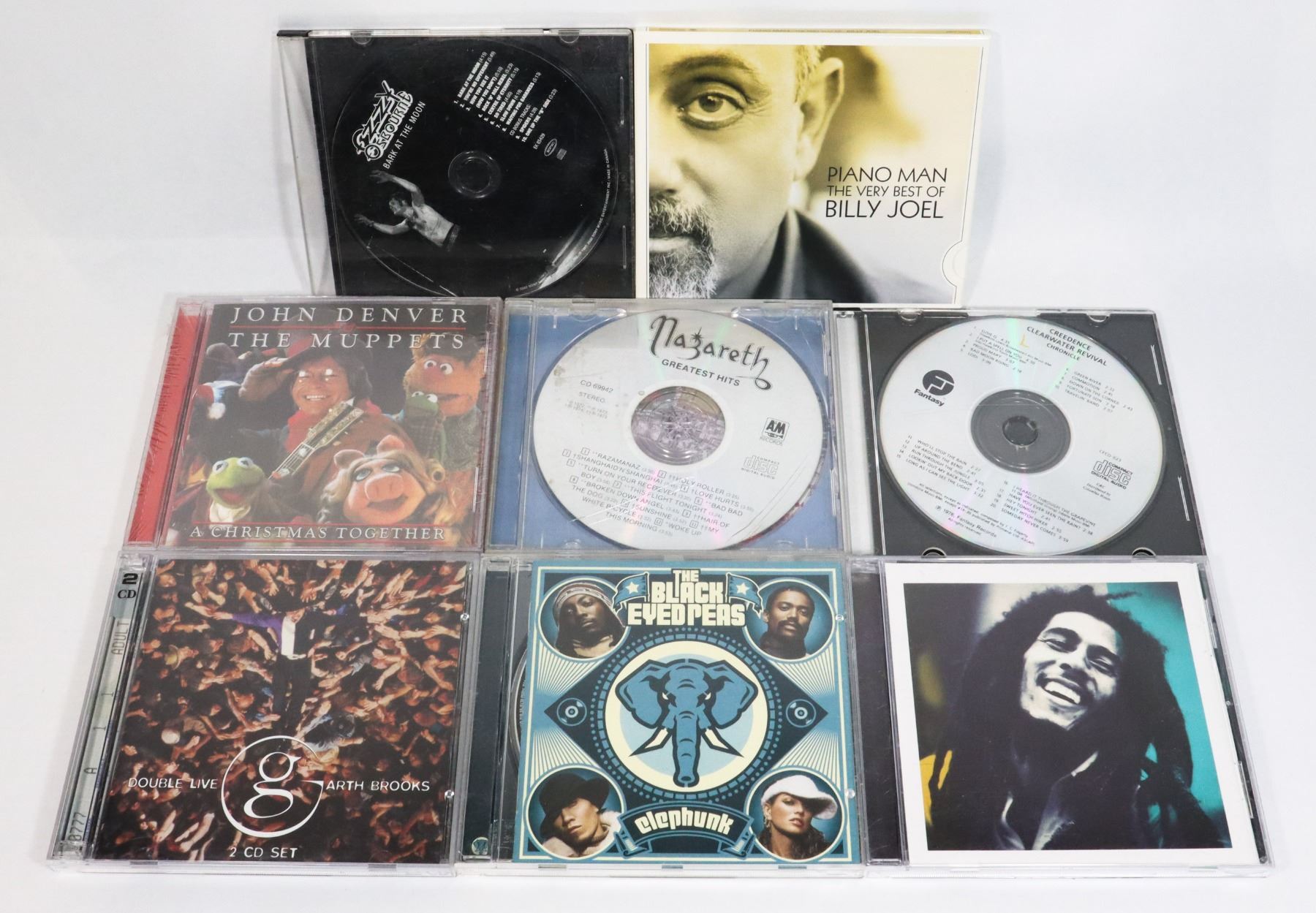 REVIVAL CHRONICLE, NAZARETH GREATEST HITS, JOHN DENVER 7 THE MUPPETS A CHRISTMAS TOGETHER, GARTH BROOKS DOUBLE LIVE 2 DISC SET, BILLY JOEL PIANO MAN, OZZY OSBOURE BARK AT THE MOON, BOB MARLEY ANT THE WAILERS, THE BLACK EYE PEAS ELEPHUNK