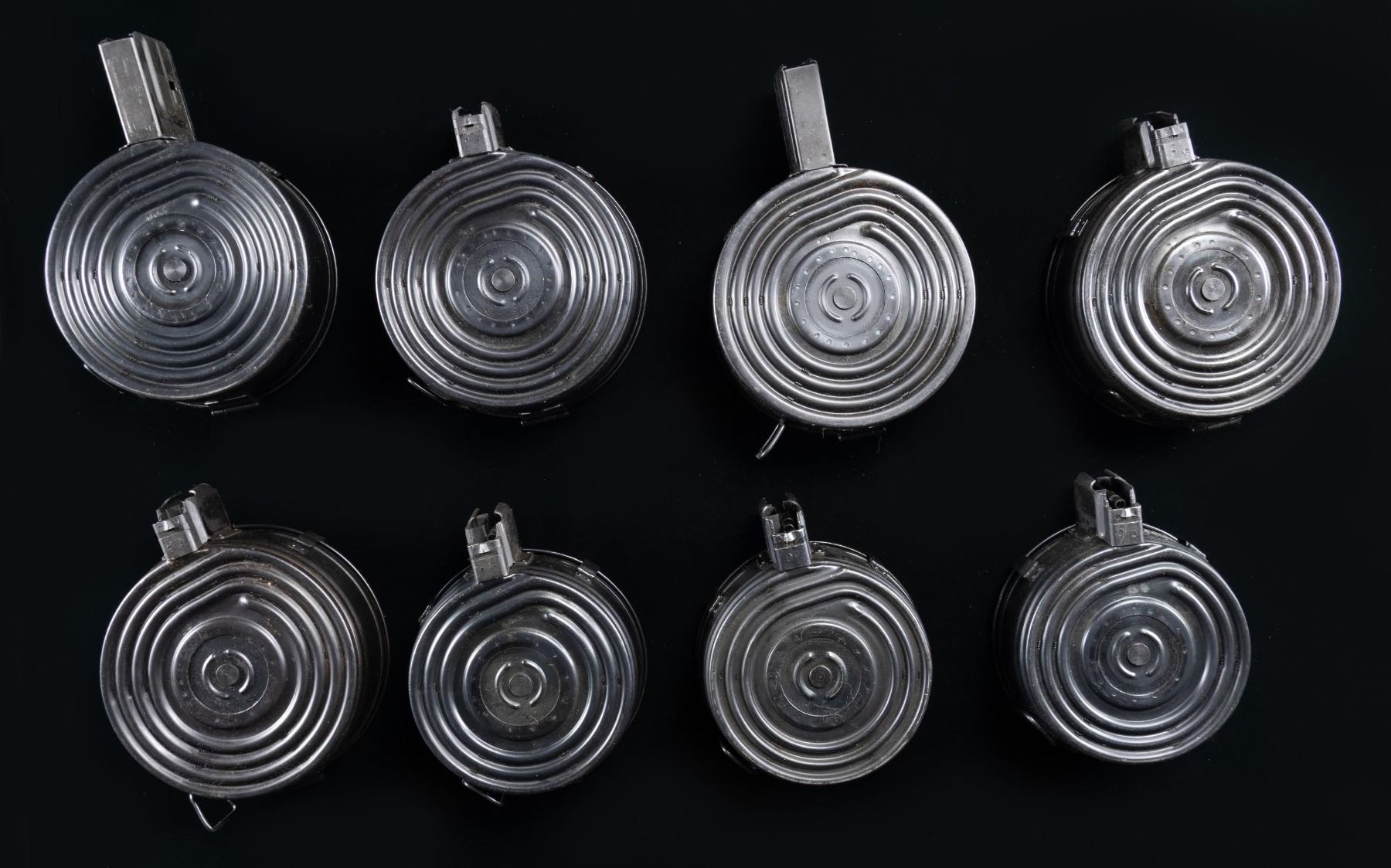 Lot consists of 8 Chinese AK & AR pattern drum mags., including: 1) x3 (approx.) 75-rd.7.62x39mm AK drum mags. Rear of 2 mags. is marked with Factory 36's "36" within a triangle insignia, with 1 marked with Factory 9396's "9396" code. Steel construction with blue finish. 2) x3 (approx.) 100-rd. 7.62x39mm AK pattern drum mags. Mags. are unmarked, with 1 mag. retaining a partially legible sticker that reads "MADE IN CHINA BY NORINCO". Steel construction with blue finish. 3) x2 (approx.) 100-rd. 5.56x45mm NATO drum mags. Rear of mags. is stamped with Factory 36's "36" within a triangle insignia. Steel construction with blue finish. CONDITION: drum mags. are all very good, showing some light wear and superficial marks from handling and storage. (02-24536-4/MLW). $800-1,200.