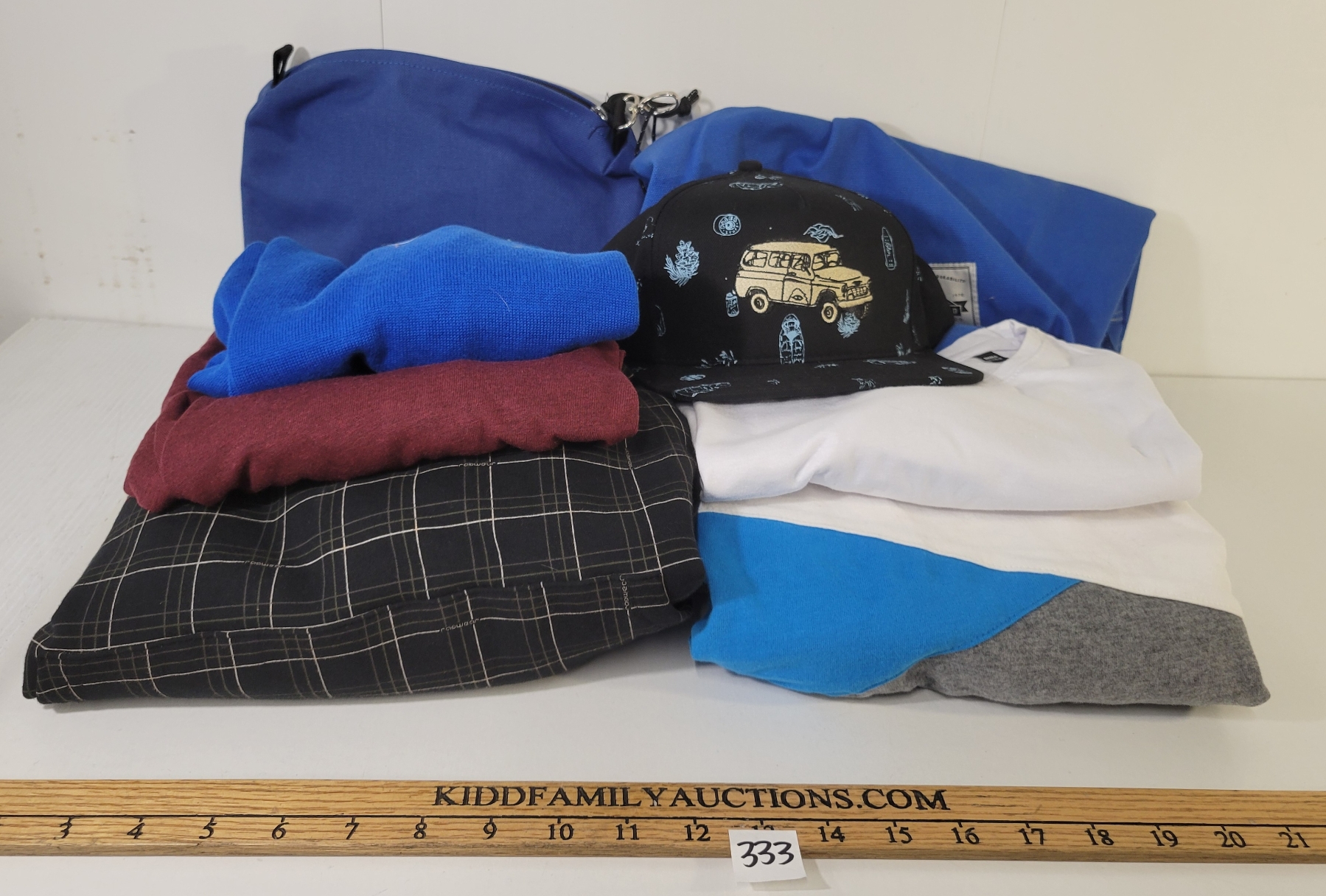 LOT OF 8 - MEN'S T-SHIRTS, SWEATERS, HAT, TAYLOR DAY PACK & DANBURY WASHBAG - MFG WESC, INSIGHT, ETC