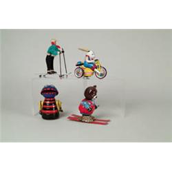Lot # 1240 LOT OF 8 MISC. MECH. TOYS. 1) Paya w/up skier in orig. box. 2) Girl feeding chickens. Tin windup by T.P.S. Japan. 3) Mouse with babies. Tin w/up. Japan. 4) Fighting dogs. Tin w/up, U.S. Zoned Germany. 5) Cat with ball. Remote control by Linemar, Japan. 6) Walking beetle w/up by Yone, Japan. 7) Bunny cycle. Tin w/up by T.Y., Japan. 8) Skiing bear. Friction tin by Yone, Japan (replaced skies). SIZE: Largest is 6-1/2" h. CONDITION: Averaging good to very good and working, unless otherwise noted. 1-29392 (250-400)