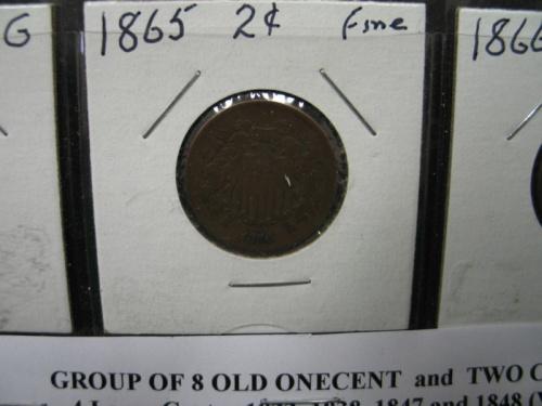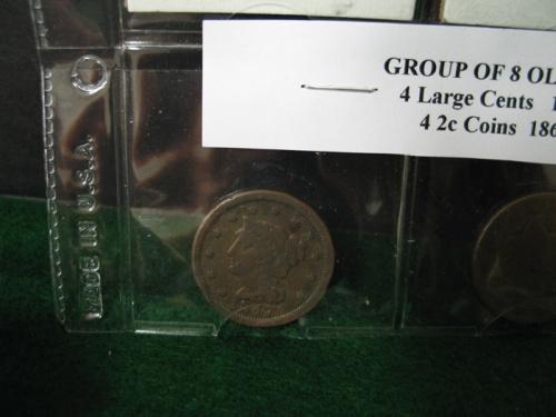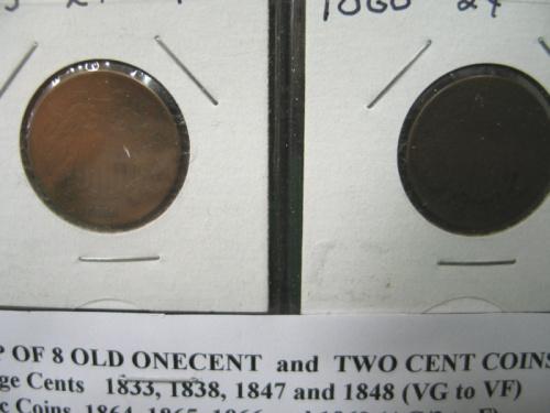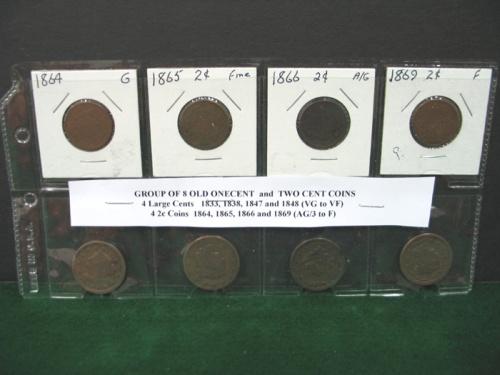 LOT OF 8 ONE CENT AND TWO CENT COINS. Consists of 4 Large cents (1833, 1838, 1847, and 1848-all VG to VF) and 4 two-cent coins (1864, 1865, 1866, and 1869-all AG/3 to F).