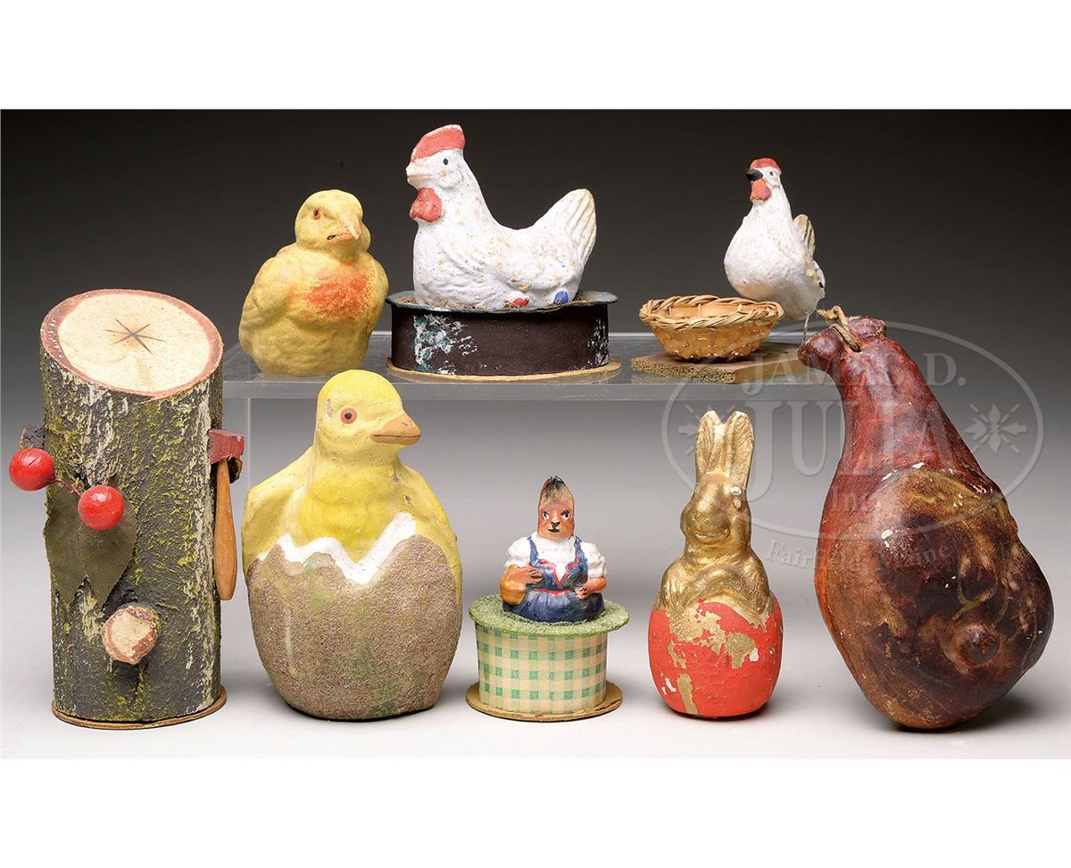 1) George Washington 1932 Birthday Candy Container. Shows cherry tree with axe marked "Germany". 2) Unusual papier mache Ham with trap door to back for access to candy enclosure. 3) German Rabbit on candy box. 4) Laying hen on box marked "Germany". 5) Composition Chick coming out of egg. No bottom cover. 6) German composition standing Hen next to candy basket. 7) Sitting chick with no cardboard cover below. 8) Composition Rabbit coming out of egg with no cardboard cover below. SIZE: Largest 5-1/2" t. CONDITION: Averages good to very good unless noted above. 1-13493