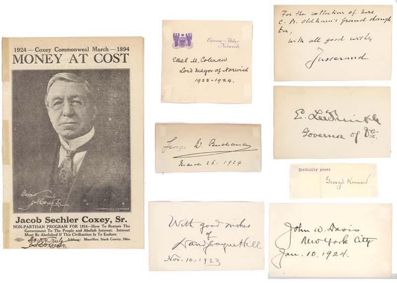 Sir George W. Buchanan (1854-1924), Ethel M. Coleman, Jacob S.Coxey, Sr. (1854-1951), John W.Davis (1873 - 1955), David Jayne Hill (1850–1932), Jean Jules Jusserand (1855 - 1932) George Kennan (1904 - 2005), E. Lee Trinkle (1876-1939). All generally fine or better.