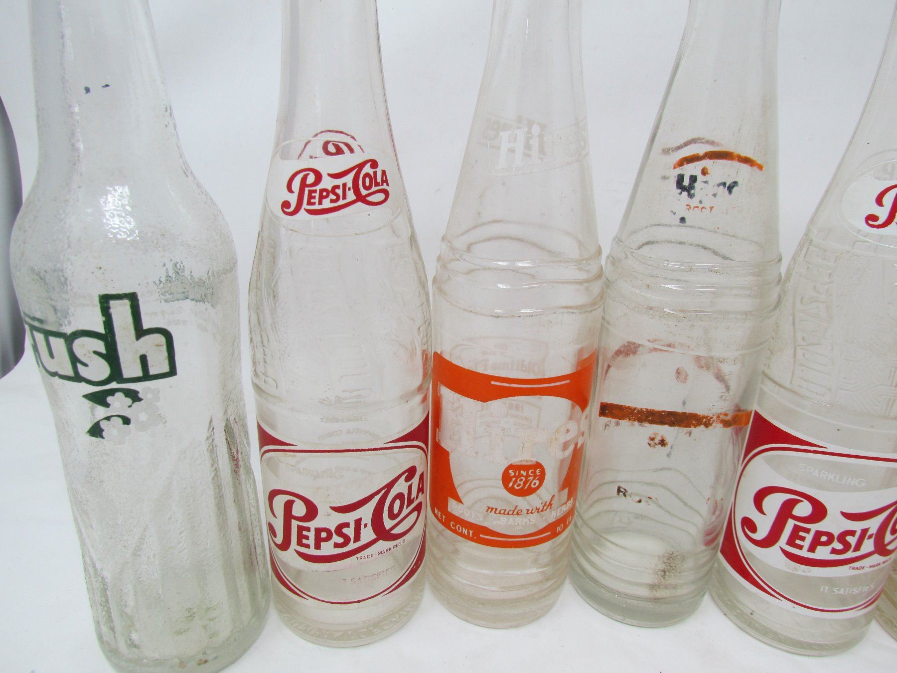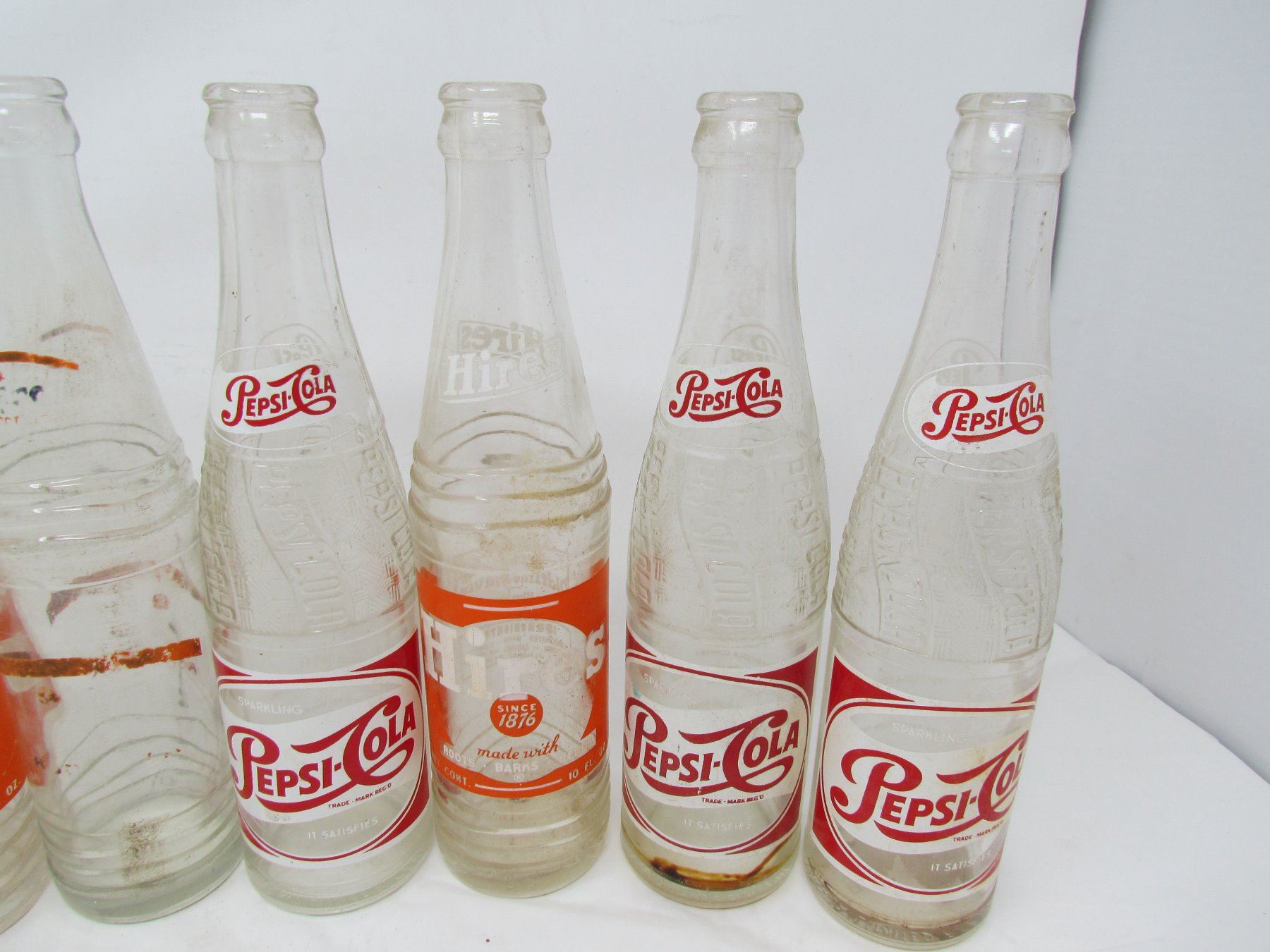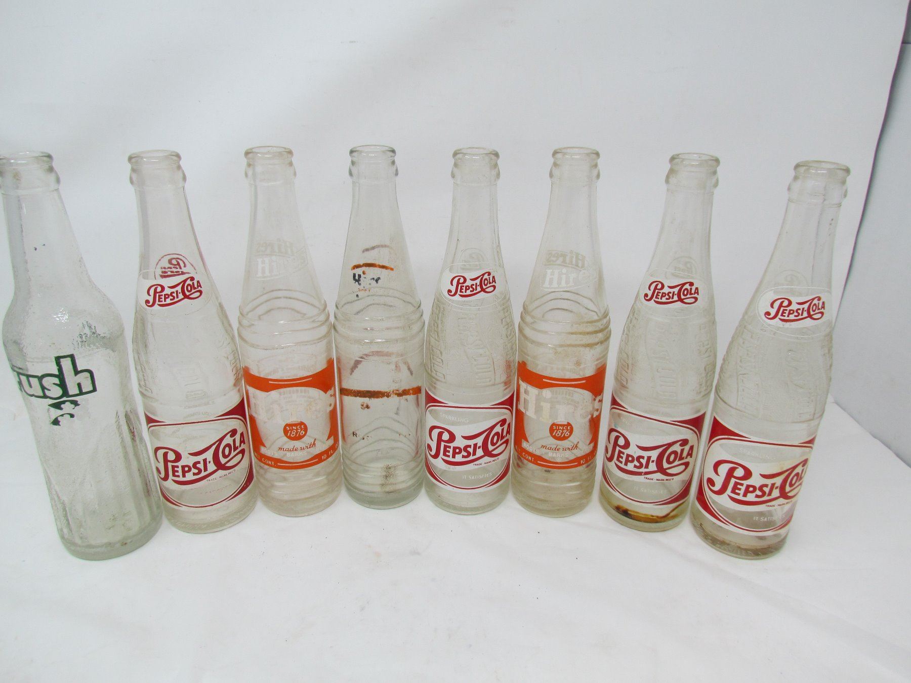 LOT OF 8 POP BOTTLES (PEPSI, HIRES, CRUSH)