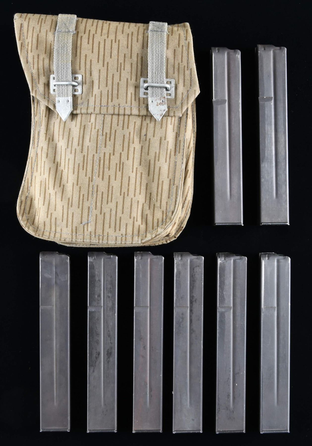 MAGAZINES. Lot consists of 8 Star Z-70 30-rd. mags. Mags. exhibit a dull blue military finish, with chrome plated followers. Mags. are housed within a East German line pattern canvas pouch. CONDITION: mags. are very good, exhibiting some light superficial marks from handling and storage. (02-23744/MLW). $300-500.