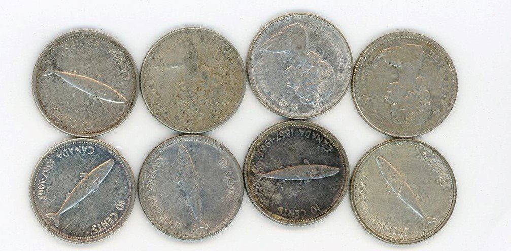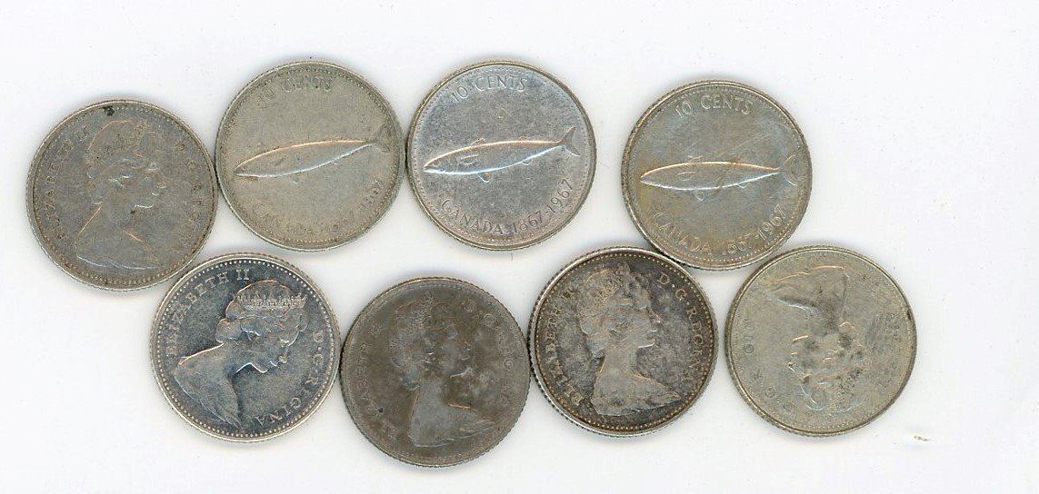 LOT OF 8 TEN CENT COINS (CANADA) *1967* (SILVER)