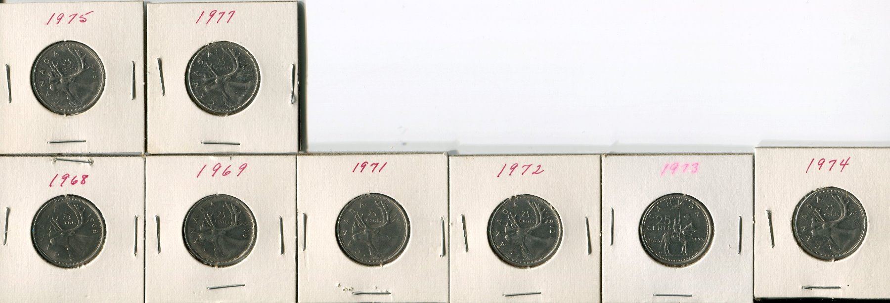 LOT OF 8 -TWENTY FIVE CENT COINS (CANADA) *1968, 69, 71, 72, 73, 74, 75, 77*