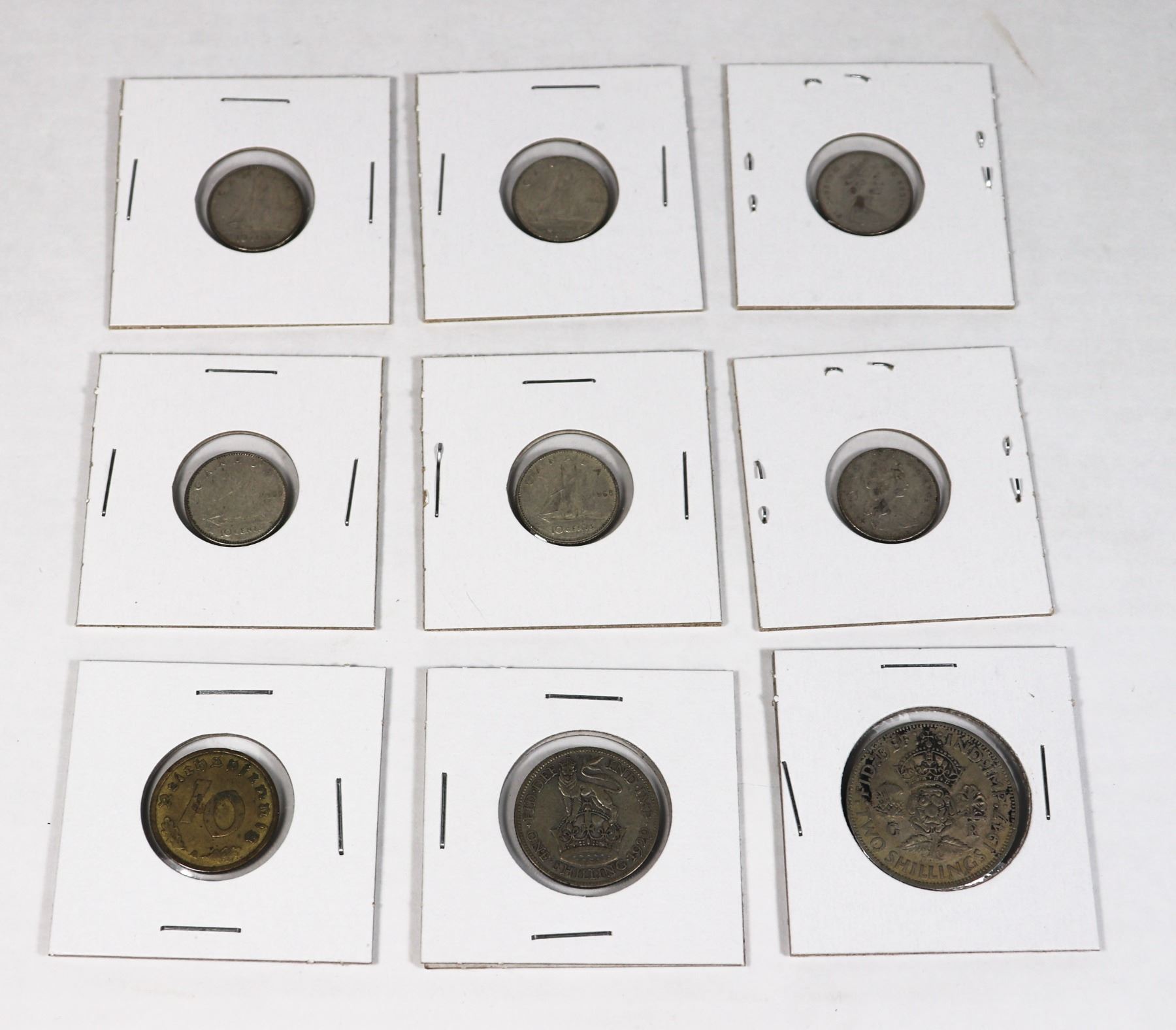DIME 10 CENTS, BRITISH 1929 ONE SHILLING COIN SILVER, BRITISH 1947 TWO SHILLINGS COIN AND GERMAN 1941 10 PFENNIG COIN WORLD WAR TWO ERA