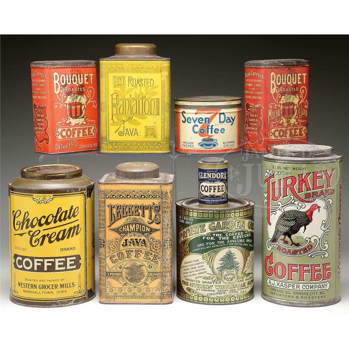 1) Turkey Brand 3 lb tin; 2) Chocolate Cream 3 lb tin; 3) Leggett's Champion Java 3 lb tin; 4) Private Garden Growth 2 lb tin; 5) Foss and Deering 2 lb tin; 6) Bouquet 1 lb tin; 7) Bouquet 1 lb tin; 8) Seven Day 1 lb tin; 9) Glendora sample tin with paper label. SIZE: 1) 5-3/8 dia x 10-1/2" t; 2) 6" dia x 9" t; 3) 5-1/8" w x 9-1/4" t x 5" d; 4) 5-1/2" dia x 6-1/2" t; 5) 5" w x 8" d; 6 & 7) 4-1/2" w x 6-1/2" t x 2-1/2" d; 8) 5" dia x 4" t; 9) 2" dia x 3-1/4" t. CONDITION: 1) Near excellent (possibly clear coated?); 2) Good to very good with a few light dents and paint scuffs; 3) Very good with some flaking paint; 4) Very good to excellent; 5) Very good with some flaking paint; 6) Very good to excellent; 7) Good; 8) Good to very good; 9) Very good to excellent. 1-13226-41