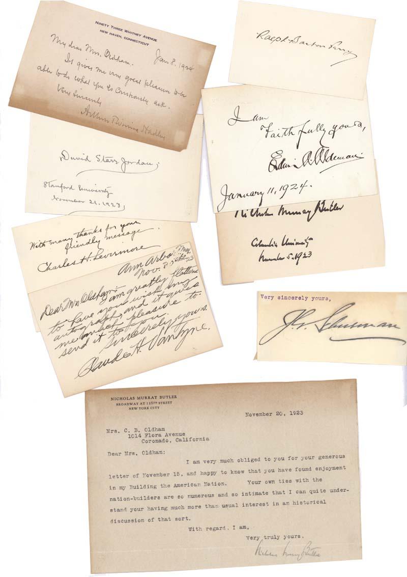 Edwin A.Alderman (1861-1931), Nicholas Murray Butler (2), Arthur Twining Hadley (1856-1930), David Starr Jordan, Charles H. Levermore, Ralph Barton Parry (1876 – 1957), J. G. Schurman, Claude H. Van Tyne (1869–1930). All generally fine or better.