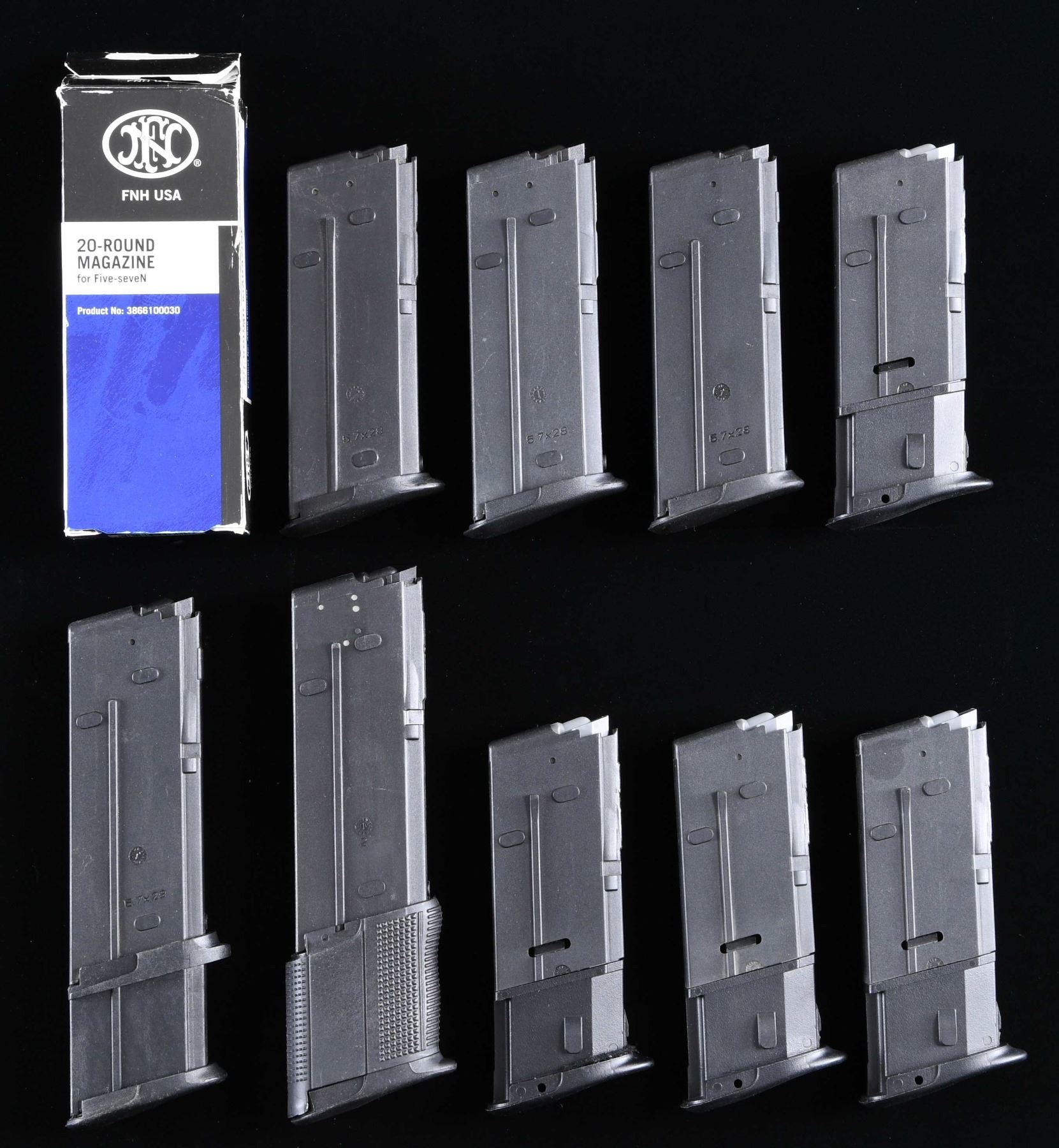 Lot of 9 FN Five-seveN mags., including: 1) 5 factory black polymer 20-rd. mags. (2 LEO marked). 1 mag. with box. 2) 4 factory black polymer 10-rd. mags. CONDITION: good, with some scattered superficial marks from handling and storage. (02-23745/MLW). $300-400.