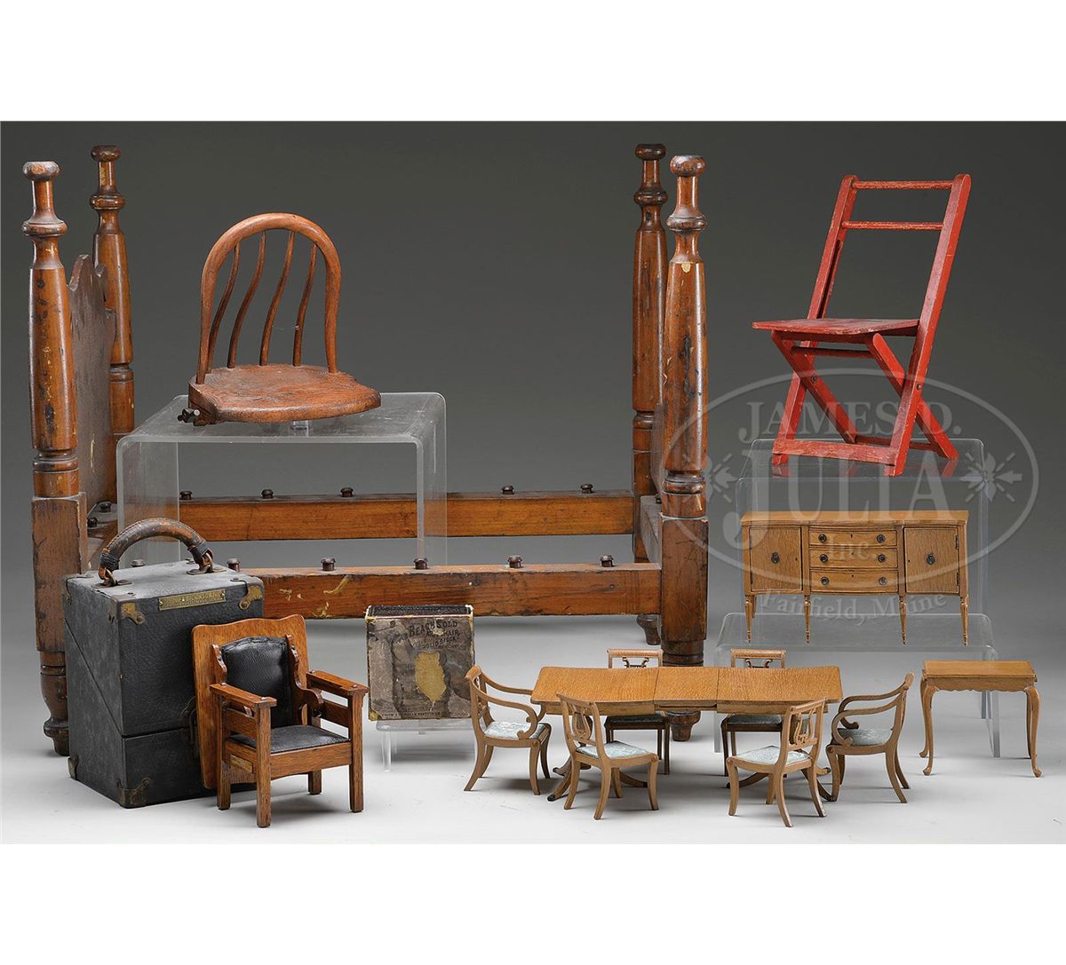 Interesting lot of miniature furniture highlighted by a most unusual chair that doubles as a table by folding the seat back into a horizontal position. Housed within its original carrying case with metal plaque stating Bishop & Dickinson, Inc. Baldwinsville, Mass, USA. Also includes a four post wooden bed frame, folding chair with advertising for the Columbus Exposition in Chicago of 1893, wooden swivel chair top, a rocking chair with its original box carved from a solid piece of mahogany to show the abilities of the J. T. Allen Scroll Saw and four pieces of well crafted Duncan-Phyfe style furniture by Studio Seagull with original boxes (made in China) including dining room table, side table, buffet and six dining room chairs. SIZE: Ranges from 3-1/2" x 3-1/2" to 26" l x 18-1/2" w. CONDITION: Chair/table and studio furniture are near excellent with remainder of lot being good to very good. 1-13582