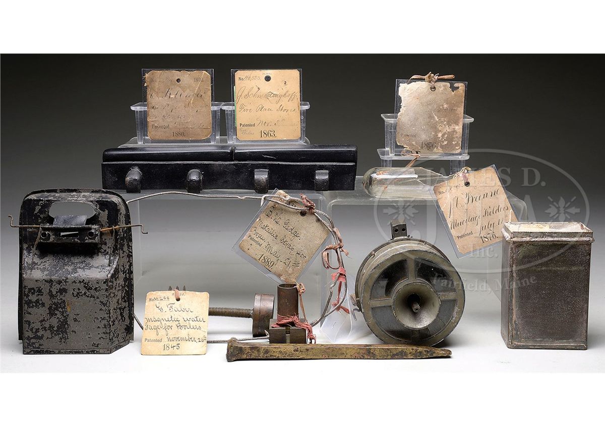 An interesting cross section of early technology many of which retain their original patent tags including Faber's Magnetic Water Gauge for Boilers, Schmedinghoff's Fireplace Stoves, Gedge's Metallic Strap for Boxes and more. SIZE: Varies. PROVENANCE: The late Terry Wesner collection, Chelsea, Michigan. CONDITION: Fair. 1-13515