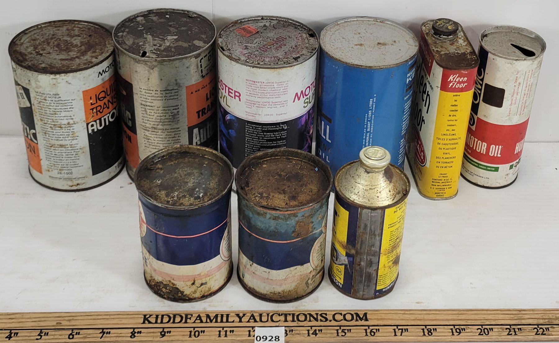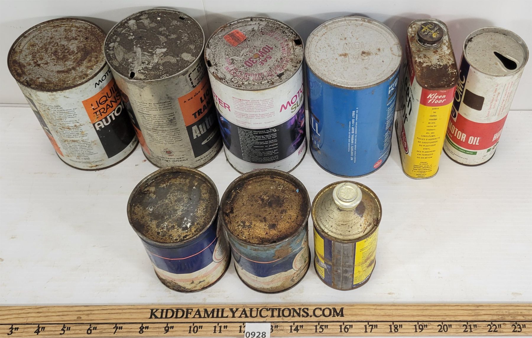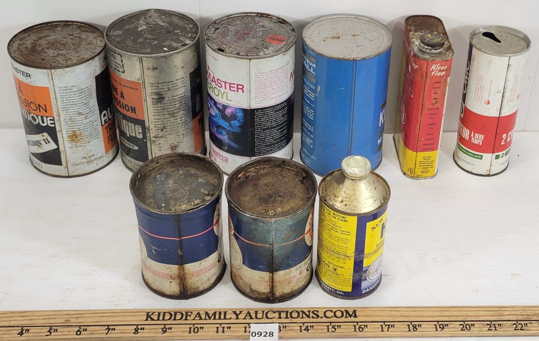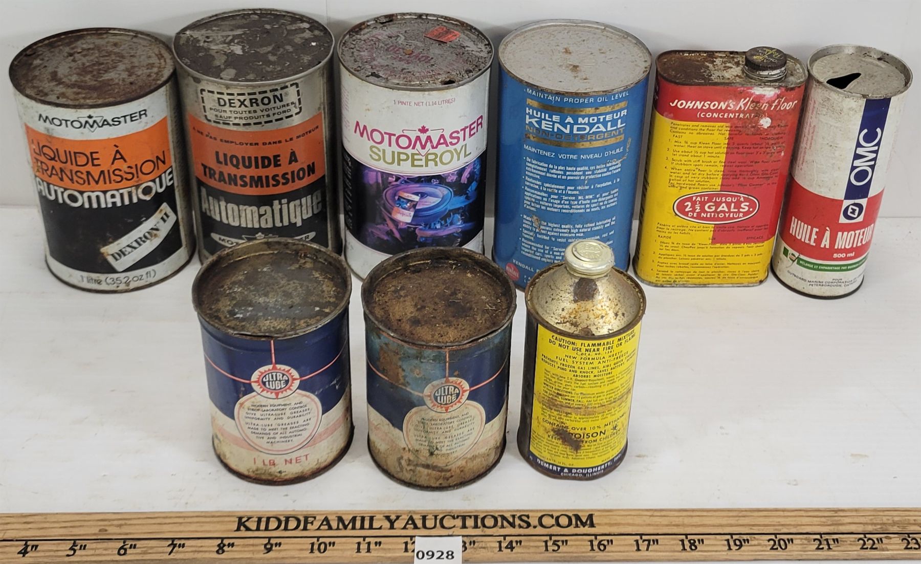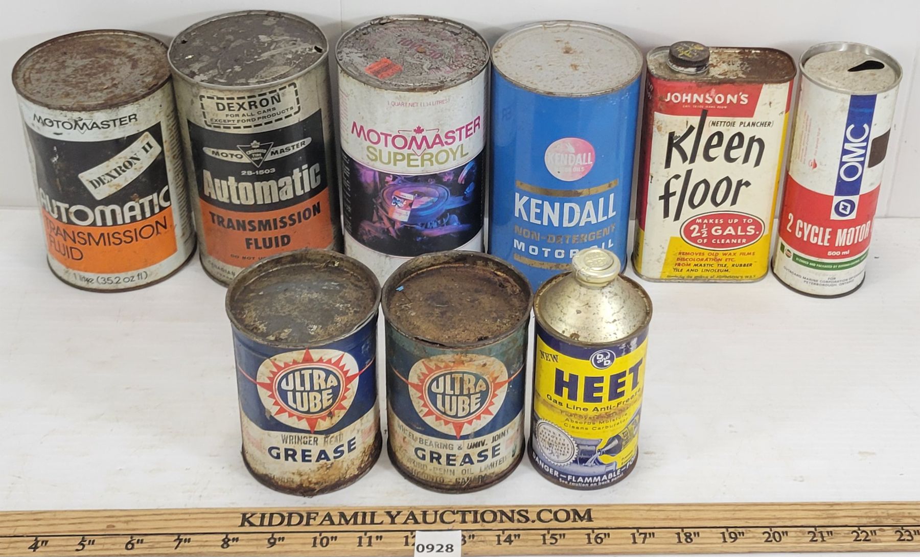 LOT OF 9 - OIL, GREASE, ANT-FREEZE, CLEANER CANS - INCL KENDALL, MOTORMASTER, ETC.