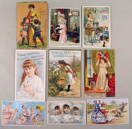 LOT OF 9 VICTORIAN TRADE CARDS - Incl. Little girls, Screw fastened Boots and Shoes, Warner's Safe Yeast, Clarks Spool Cotton, Quaker Buckwheat, Wheeler and Wilson Sewing Machines, more