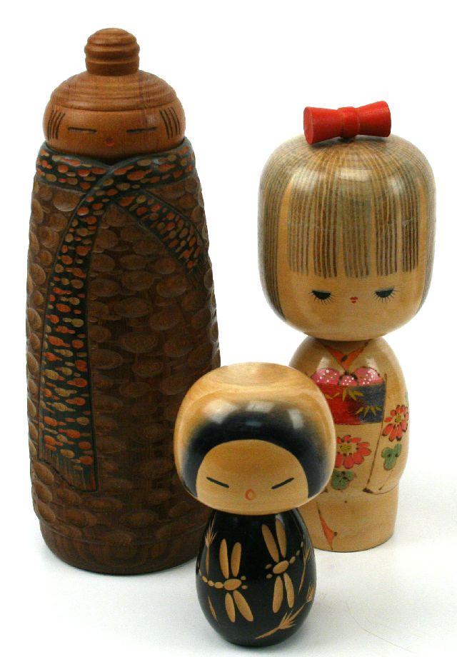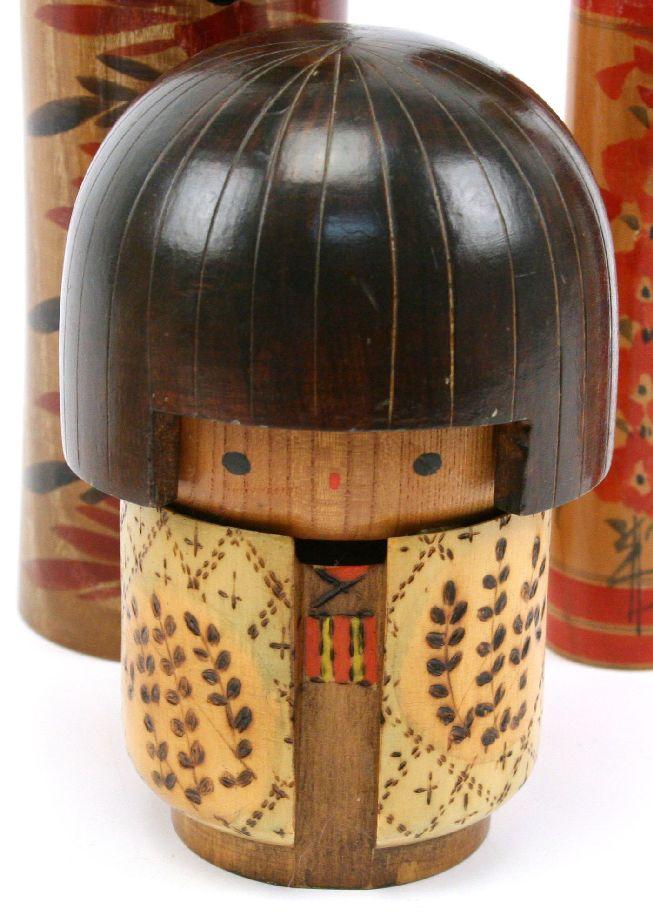 A collection of 9 Japanese Kokeshi dolls dating mostly to the 1970's. Many pieces signed by the artist and range from 14 to 5 inches in height. Overall very good condition with minor paint loss to a few pieces.