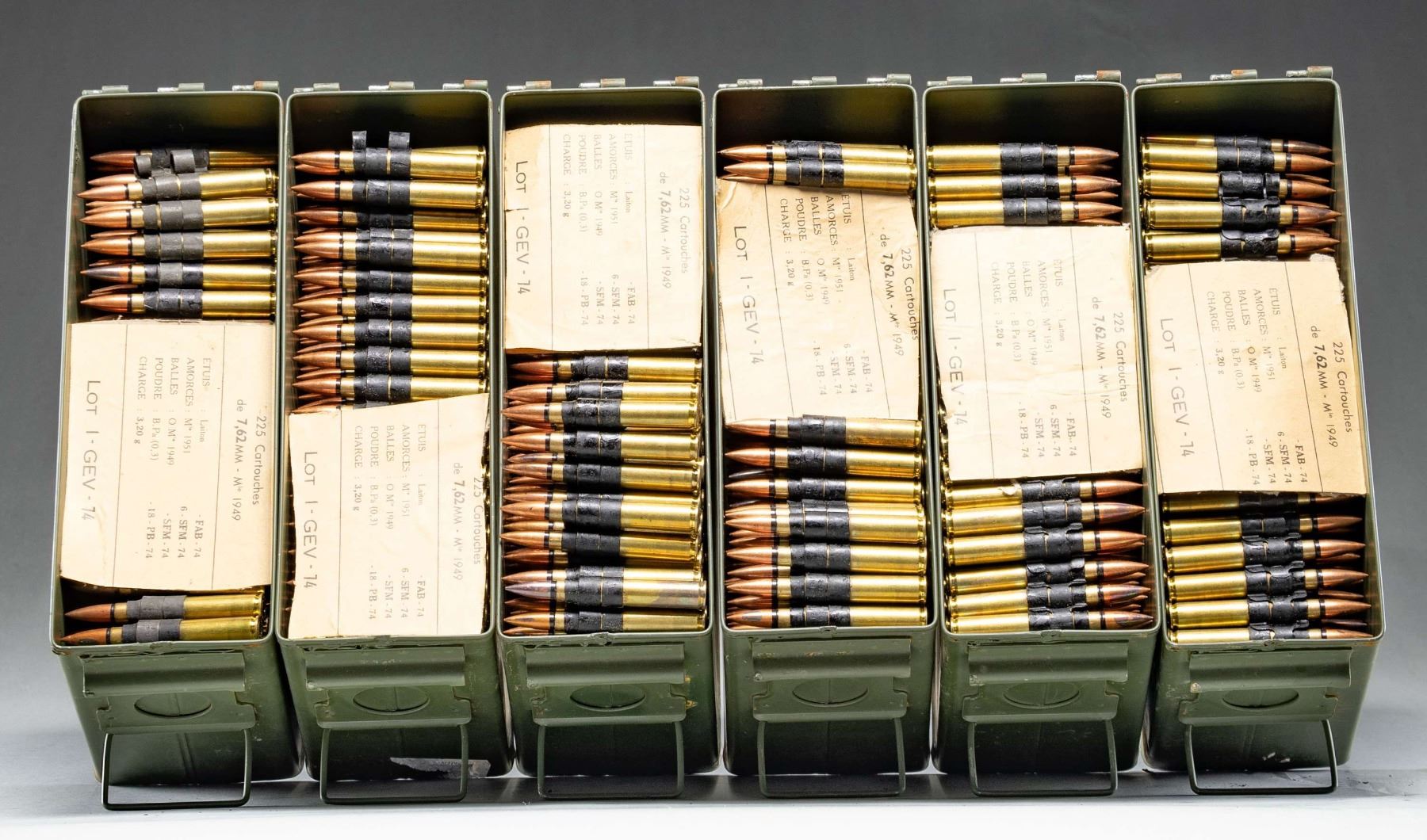 AMMO. Ammo is Gevelot headstamped with 1950's dates & on what appears to be metal 1919 links. Ammo is no doubt corrosive & further housed in 6 USGI 30 Cal. ammo cans. CONDITION: ammo appears generally good to very good with some moderate tarnishing. (02-25478-1/MJC). AMMO. $400-600 for lot.