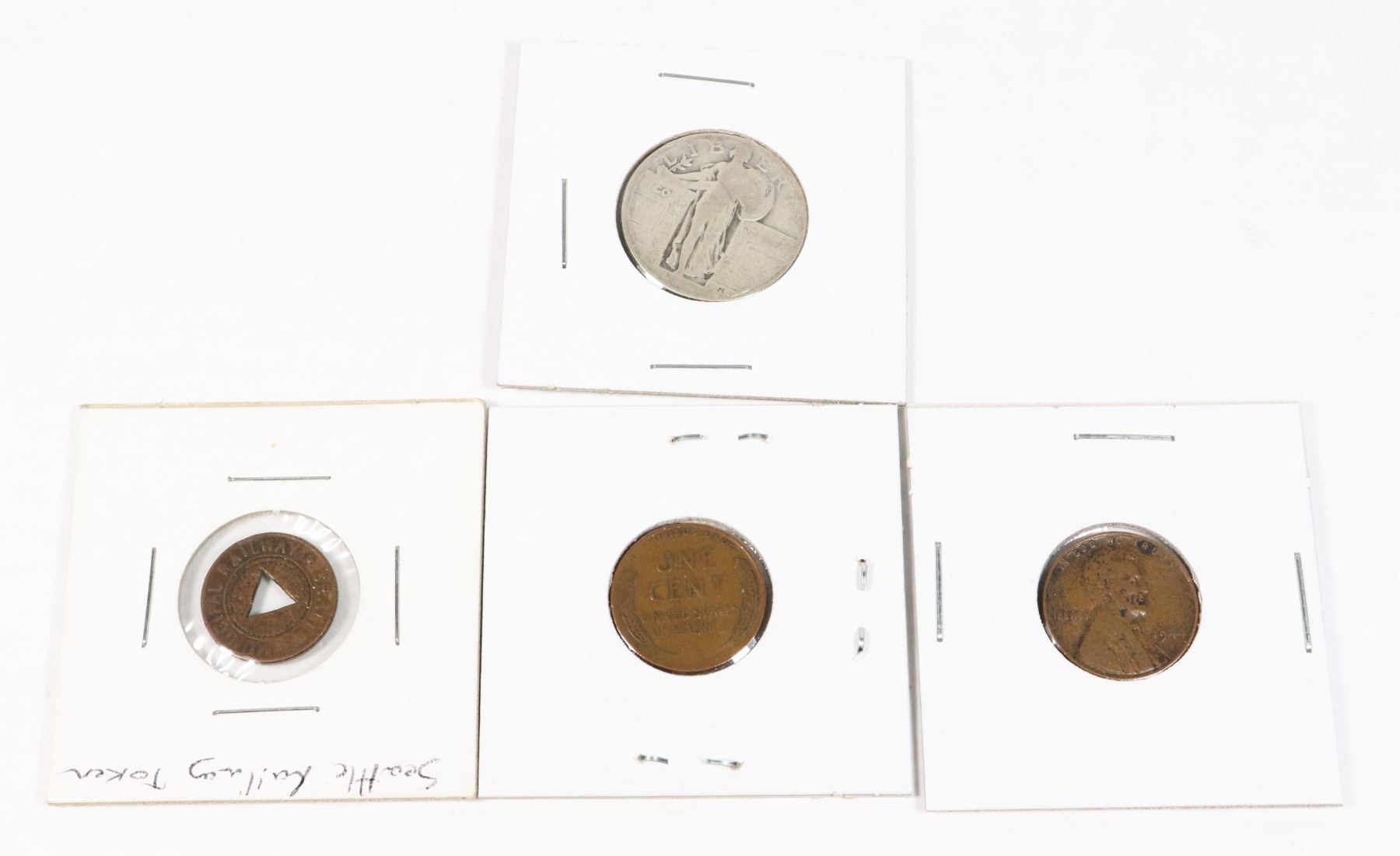SILVER AMERICAN LIBERTY QUATER DOLLAR 2 WORLD WAR II AMERICAN PENNIS 1944 & 1945 SEATTLE RAILWAY TOKEN MUNICIPLE***ITEM(S) LOCATED IN LETHBRIDGE ALBERTA, FREE TRANSPORT TO OUR EDMONTON OFFICE AVAILABLE. WORLDWIDE SHIPPING IS AVAILABLE***
