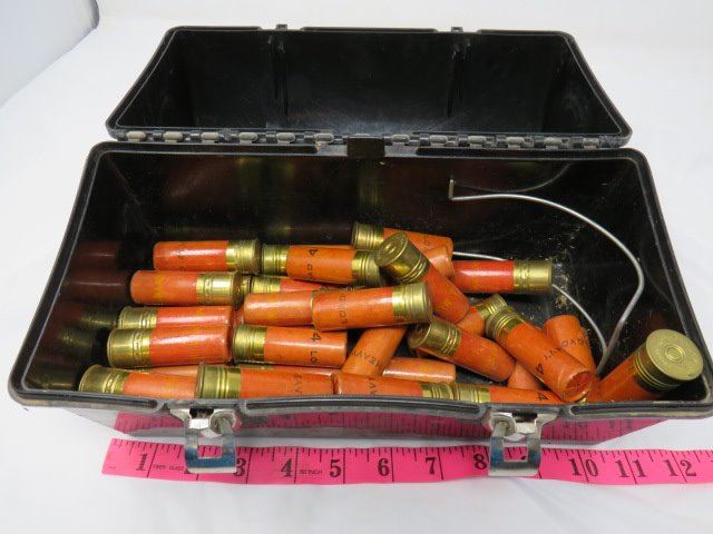 LOT OF AMMUNITION (12 GAUGE) IN BLACK LUNCH BOX (VINTAGE) *OVER 40*