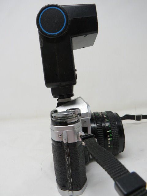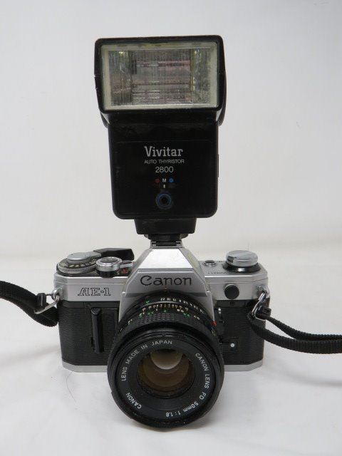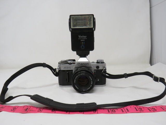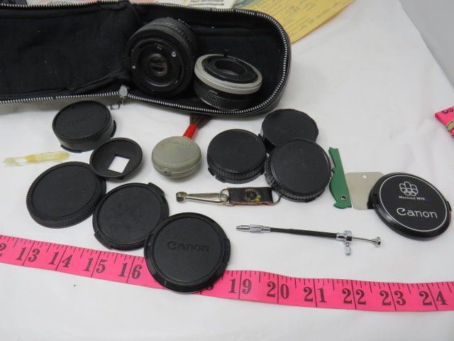 LOT OF ANTIQUE CAMERA, ASST LENS, RECORD OF PURCHASE, MANUALS AND BAG (CANON, VIVITAR ETC...)