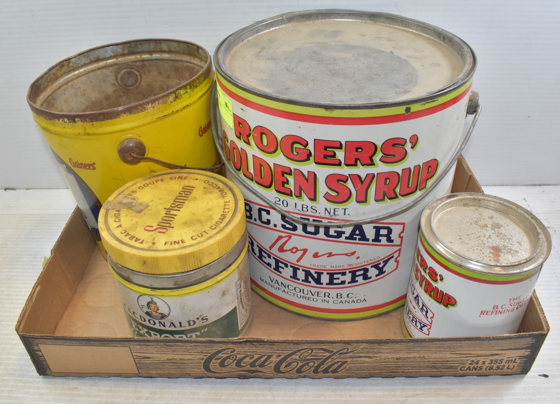 2 SYRUP CANS, 1 TOBACCO CAN, 1 LARD CAN