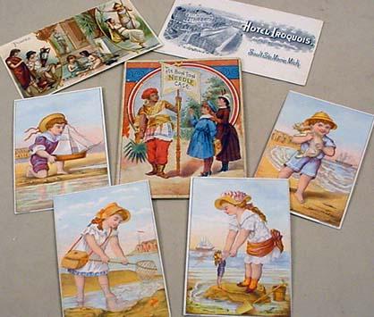 LOT OF ANTIQUE PAPER - INCL. VICTORIAN TRADE CARDS - Also incl. Bonton Needlecase, Hotel Iroquois - Sault Ste Marie, Mich.