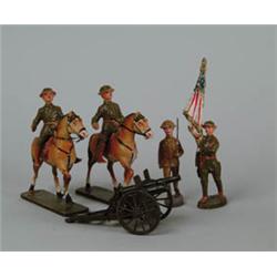 Lot # 326 LOT OF APPROX. 20 ELASTOLIN SOLDIERS. Lot includes 4" marching doughboy composition figures along with mounted soldiers and one Britain cap firing die cast canon. SIZE: Mounted soldier is 5-1/2". CONDITION: Average is very good. 1-28623 (100-200)