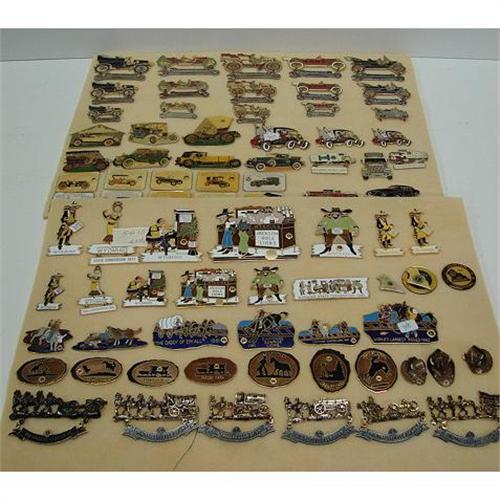 LOT OF APPROX. 78 LIONS CLUB PINS. Consists of Western themed pins from Wyoming, Stagecoach pins from the Pin Traders Club of Virginia, Automobile themed pins from Ohio District 13-E, Pennsylvania Cars of Yesterday pins, District 14-C car and truck pins. Pins are from the 1970s and 1980s.