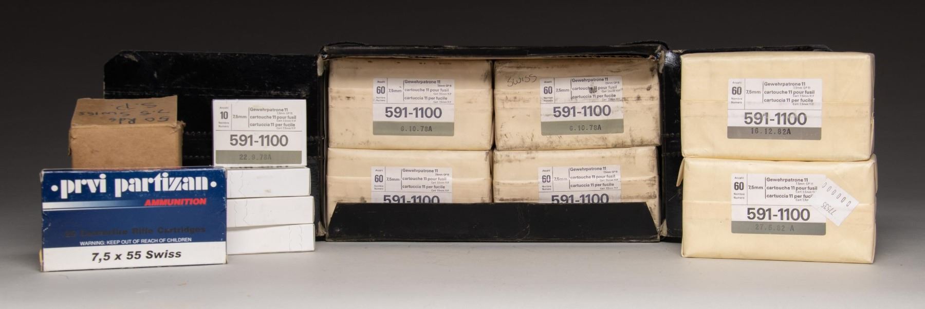 7.5X55MM SWISS AMMUNITION. Lot of approx. 690-rds. of assorted 7.5x55mm Swiss ammunition, including: 1) 1 480-rd. box (containing 8 60-rd. packs) of Swiss arsenal 7.5x55mm Swiss ammunition. 2) 2 60-rd. packs (120-rds. total) of Swiss arsenal 7.5x55mm Swiss ammunition. 3) 4 10-rd. boxes (40-rds. total) of Swiss arsenal 7.5x55mm Swiss ammunition. 4) 1 approx. 30 count box of loose 7.5x55mm Swiss ammunition (inspection of several headstamps suggests Swiss arsenal ammunition). 5) 1 20-rd. box of Prvi Partizan 7.5x55mm Swiss, SP11, 30g ammunition. 6) CONDITION: good, with the bulk of the ammunition remaining sealed. Loose ammunition shows age related discoloration, but otherwise appears serviceable. (02-24542-1/MLW). AMMO. $300-500.