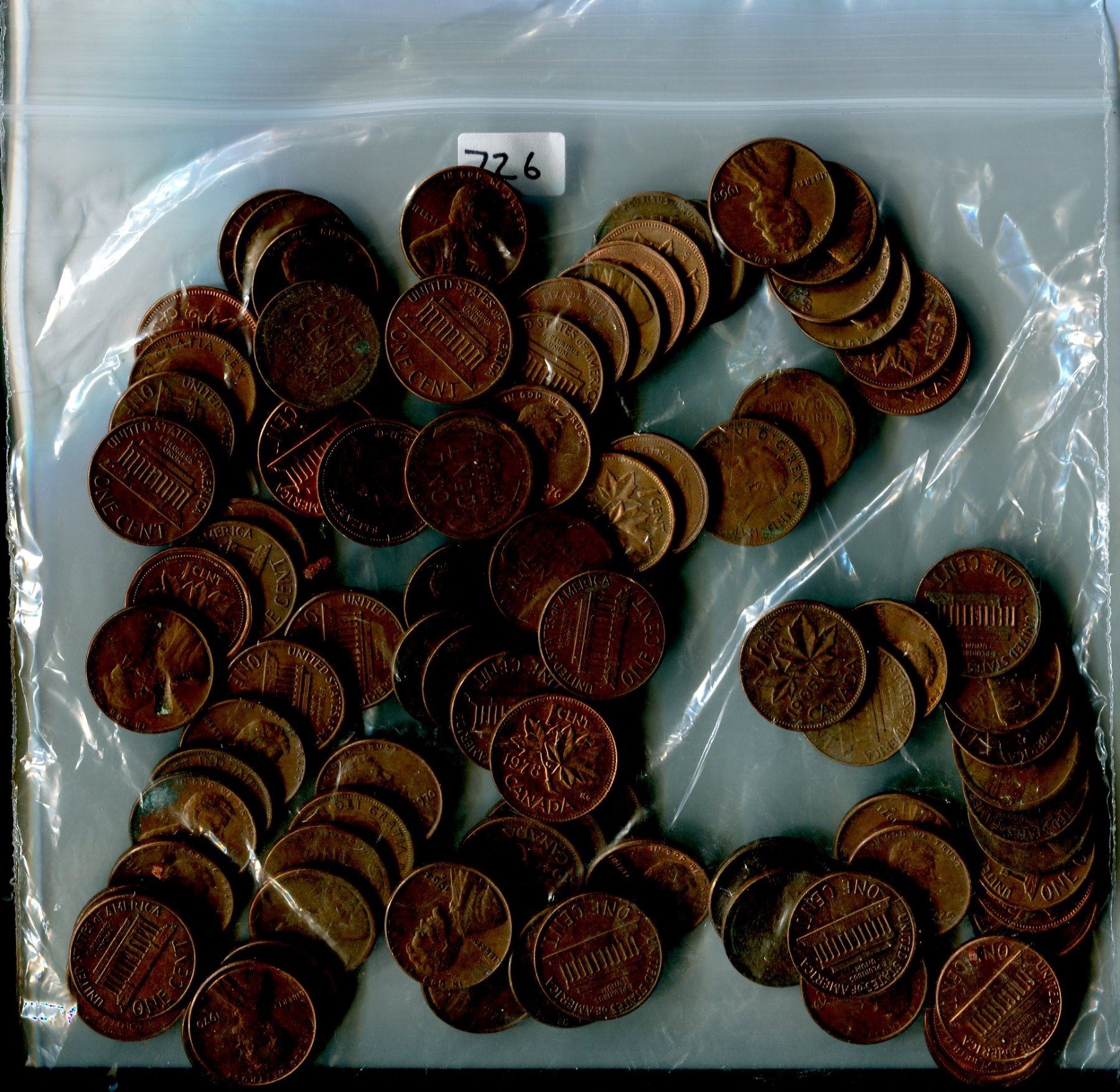 LOT OF APPROXIMATLY 100 -1 CENT COINS (MOSTLY USA, SOME CANADIAN) *ASSORTED DATES* (NICE SELECTION)