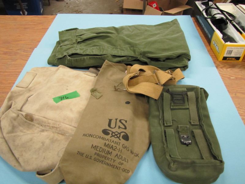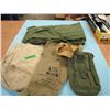 LOT OF ARMY PANTS, SUSPENDERS, CANVAS POUCH ETC.