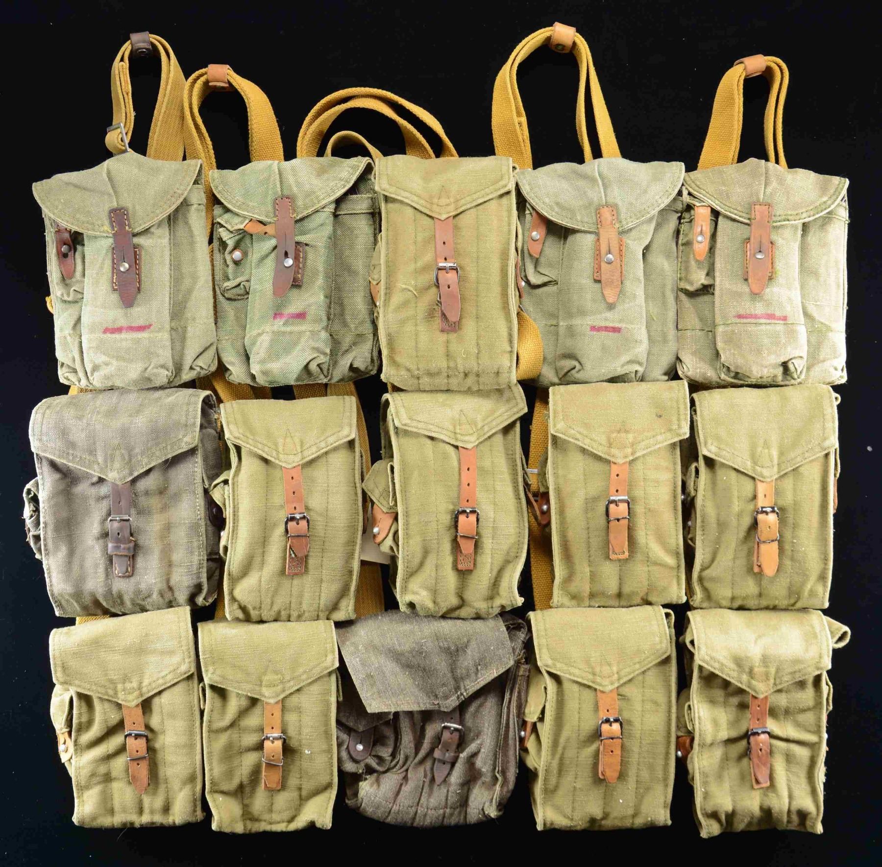 Lot of assorted 7.62x39mm mags. and pouches, including: 1) 5 canvas 4-cell pouches containing 4 30-rd. AK 7.62x39mm mags. each (1 pouch with 3 mags., 19 mags. total). 2) 3 canvas 3-cell pouches containing 3 30-rd. AK 7.62x39mm mags. each (9 mags. total). 3) 1 canvas 5-cell pouch containing 5 30-rd. AK 7.62x39mm mags. 4) 1 canvas 3-cell pouch containing 3 unmarked assorted Ruger Mini-30 mags. 5) 1 canvas 4-cell pouch containing 2 assorted Ruger Mini-30 mags. and 1 ASC 7.62x39mm AR mag. 6) 1 canvas 4-cell pouch containing 4 7.62x39mm ASC AR mags. 7) 2 empty canvas 4 cell mag. pouches. 8) 1 empty canvas 5-cell mag. pouch. CONDITION: good, with exterior of pouches exhibiting wear from use and handling. Some leather fittings exhibit some wear, with all appearing sturdy and serviceable. Mags. exhibit varying degrees of wear and scattered marks from handling and storage, but otherwise remain sturdy and serviceable. (02-23323/MLW). $300-500.