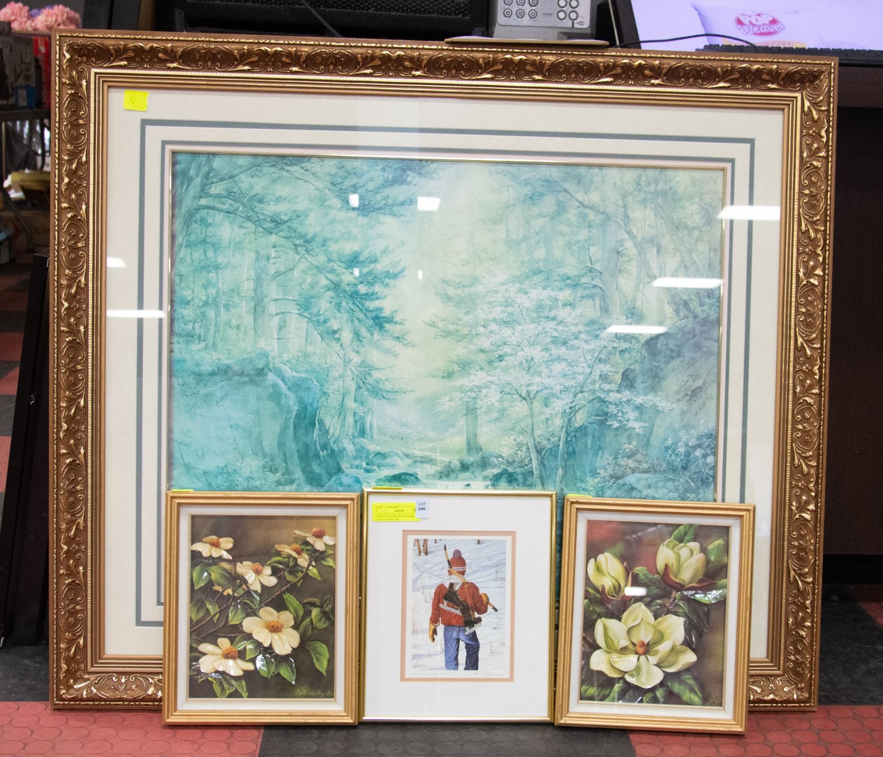 #4249 OF #5520 LIMITED EDITION FRAMED AND MATTED 36" X 42", HENRY RIPPLINGER "HEADED TO THE RINK" FRAMED AND MATTED 10" X 12", SET OF TWO VINTAGE 3D LAYERED FLOWER ART FRAMED 10" X 12"