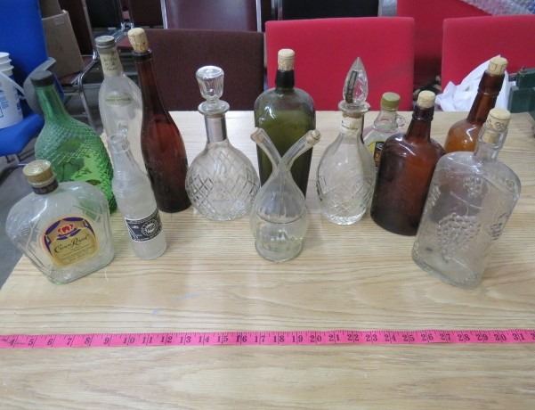 LOT OF ASSORTED BOTTLES AND DECANTERS (CROWN ROYAL, CANADIAN WHISKEY, ETC.)