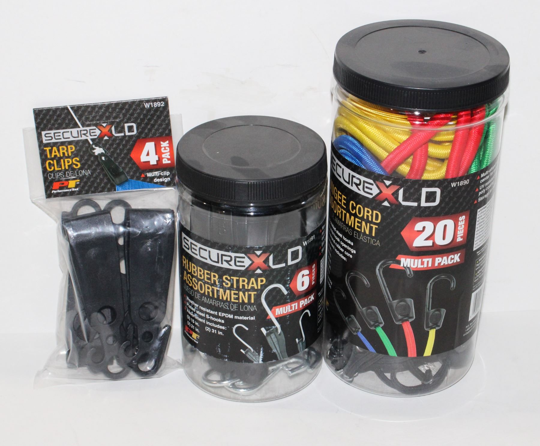 LOT OF ASSORTED BUNGEES AND PACK OF TARP CLIPS