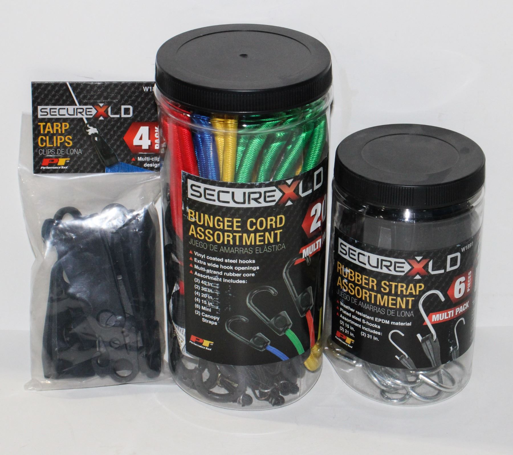 LOT OF ASSORTED BUNGEES AND PACK OF TARP CLIPS