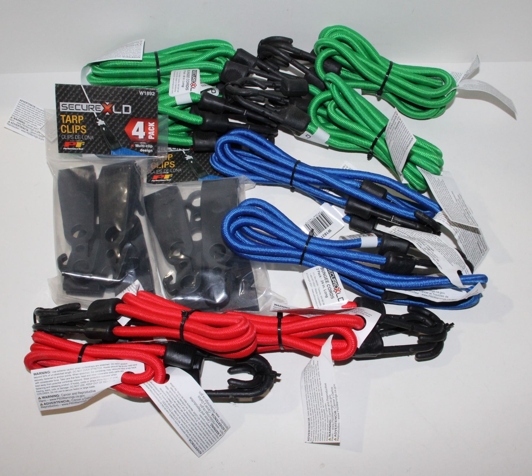 LOT OF ASSORTED BUNGEES AND PACK OF TARP CLIPS