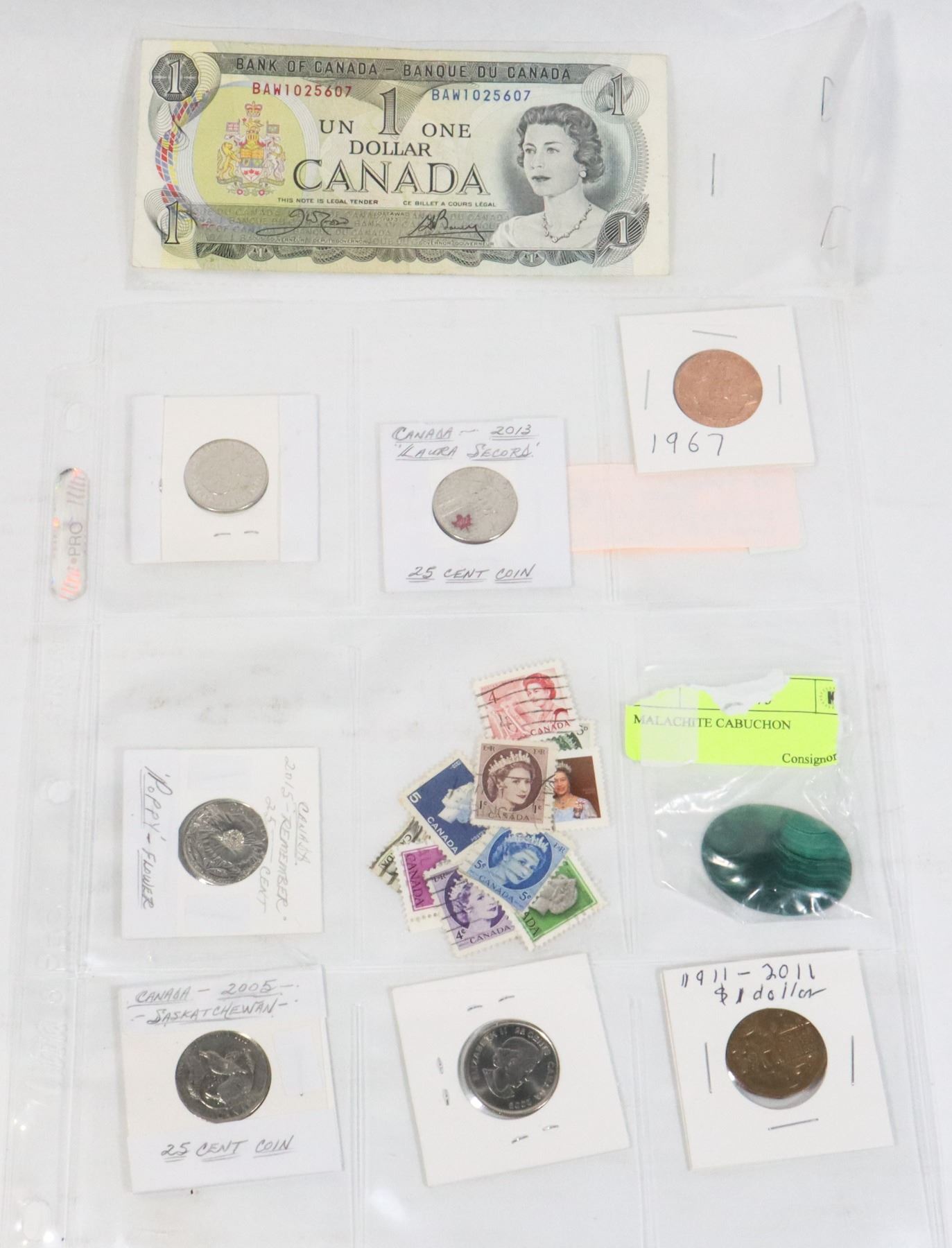 LOT OF ASSORTED CANADIAN COINS, STAMPS & 1 DOLLAR