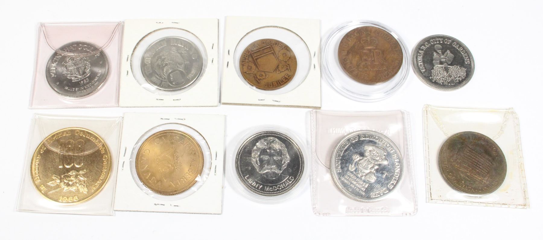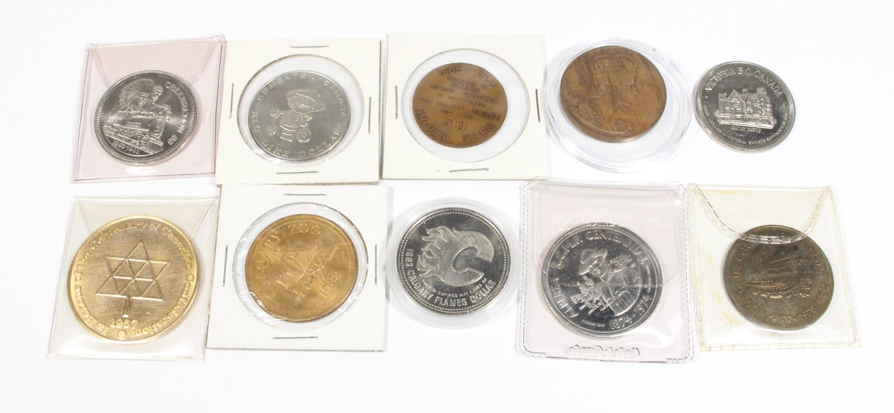 VICTORIA BRITISH COLUMBIA TOKEN COIN 1979, BRITISH COLUMBIA CENTENARY 1967 COIN TOKEN, EDMONTON ALBERTA 1978 GAMES TOKEN COIN, EDMONTON ALBERTA 1974 RCMP TOKEN COIN, AND CALGARY FLAMES DOLLAR 1982 ALBERTA COIN (LANNY MCDONALD), AND MORE
