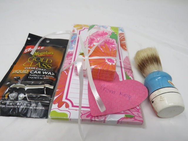 LOT OF ASSORTED CAR WAX, SHAVING BRUSH, SUN GLASSES, ETC