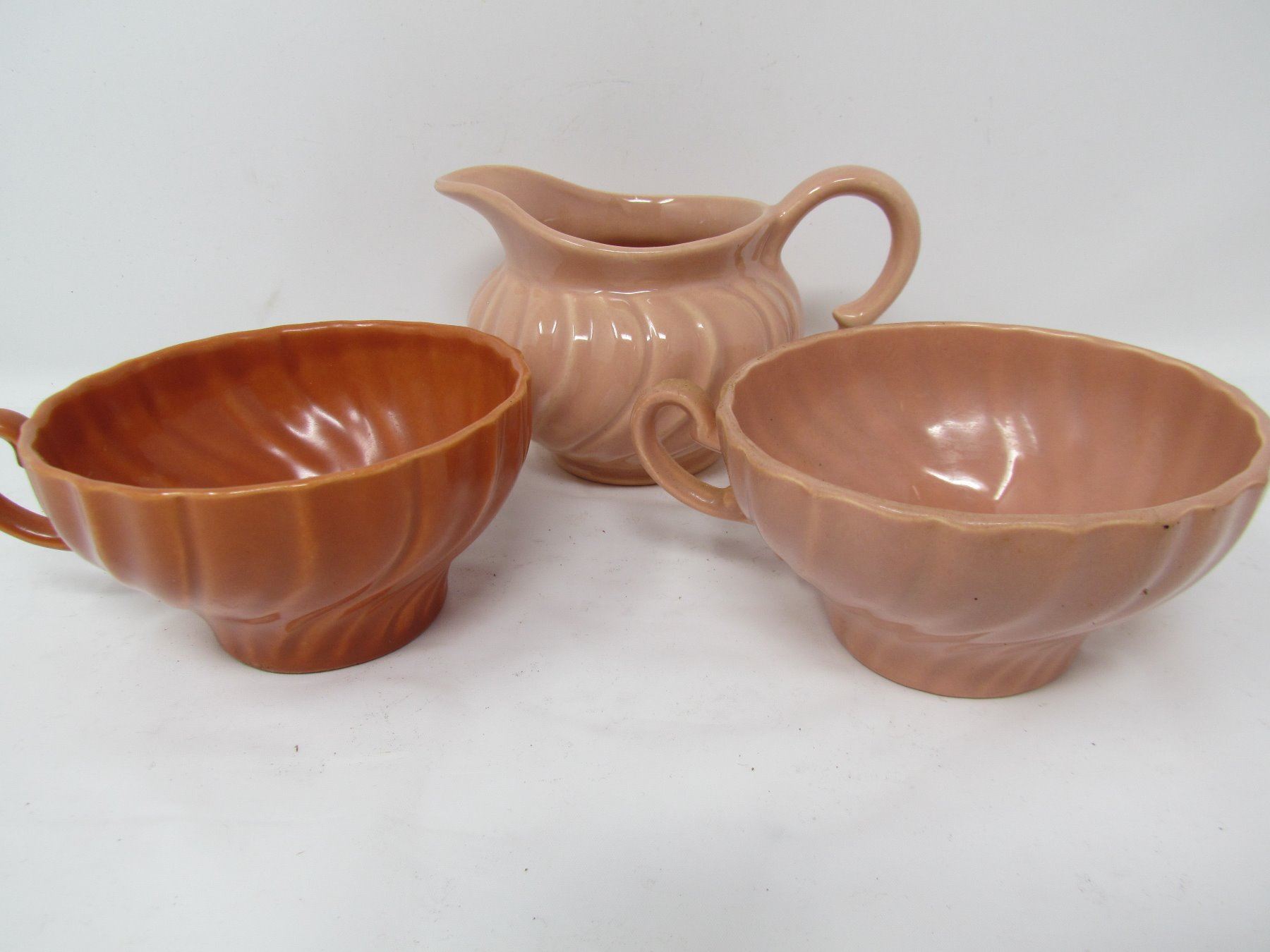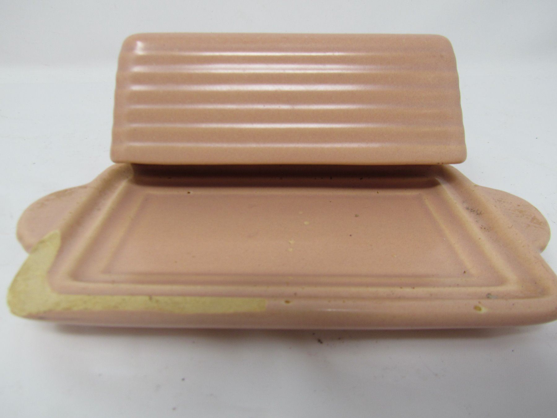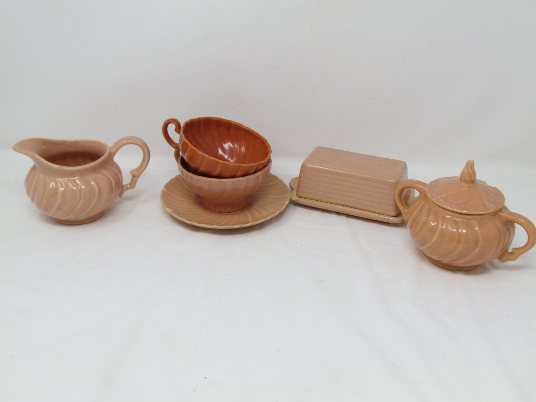 LOT OF ASSORTED CUPS, SUGAR, CREAM AND BUTTER CONTAINER (SOME CRACKS AND CHIPS ON FINISH)
