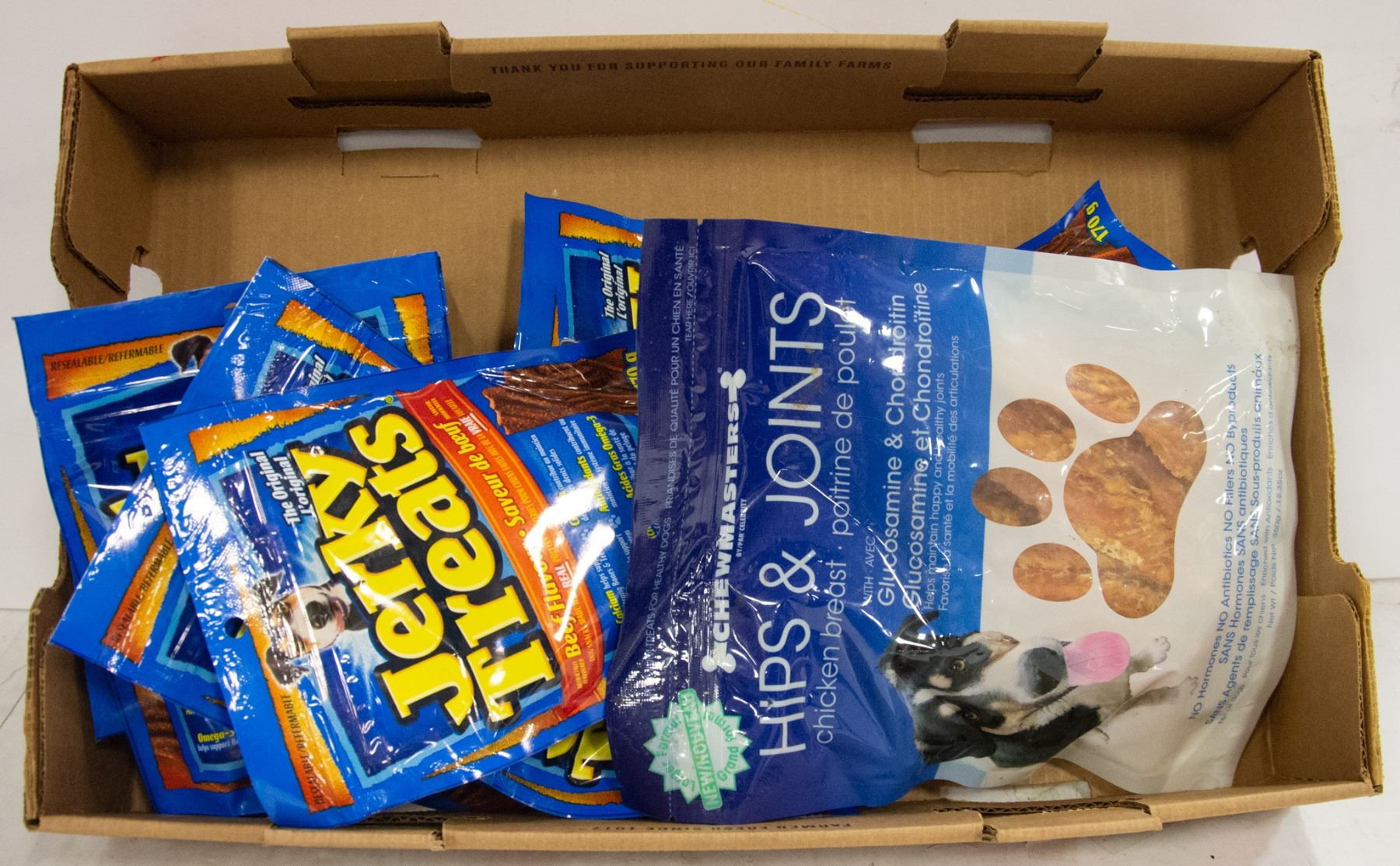 LOT OF ASSORTED DOG FOOD, TREATS & DENTAL STICKS