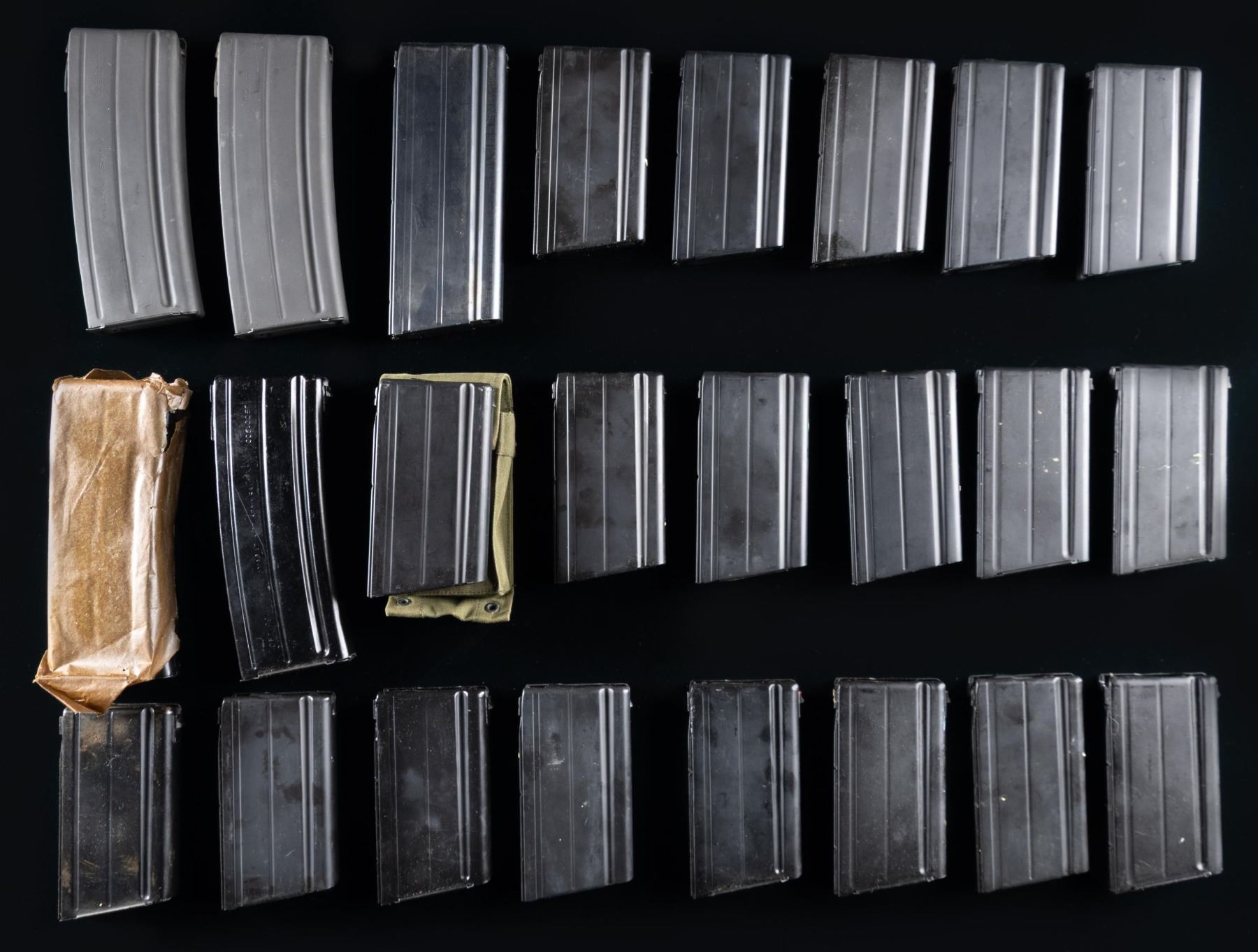MAGAZINES. Lot of assorted FAL Inch and Metric pattern mags., including: 1) x12 20-rd. Inch pattern mags. 2) x7 20-rd. Metric pattern mags. (x1 in canvas mag. pouch). 3) x3 40-rd. Inch pattern mags. 2 with slight curve and parkerized finish marked "OFT1994", "MAGAZINE 7.62MM3A1", and "1005-005-710" on right side. 1 unmarked straight body with blue finish. 4) x2 40-rd. Inch pattern mags. Black enamel finish. Mags. are marked "OFT1994", "MAGAZINE 7.62MM3A1", and "1005-005710" on right side. CONDITION: mags. are good, showing varying degrees of wear, but with all otherwise appearing serviceable. (02-24536-3/MLW). $600-1,000.