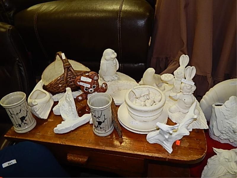 LOT OF ASSORTED FINISHED/UNFINISHED BAKED CERAMICS - (ON DESK)