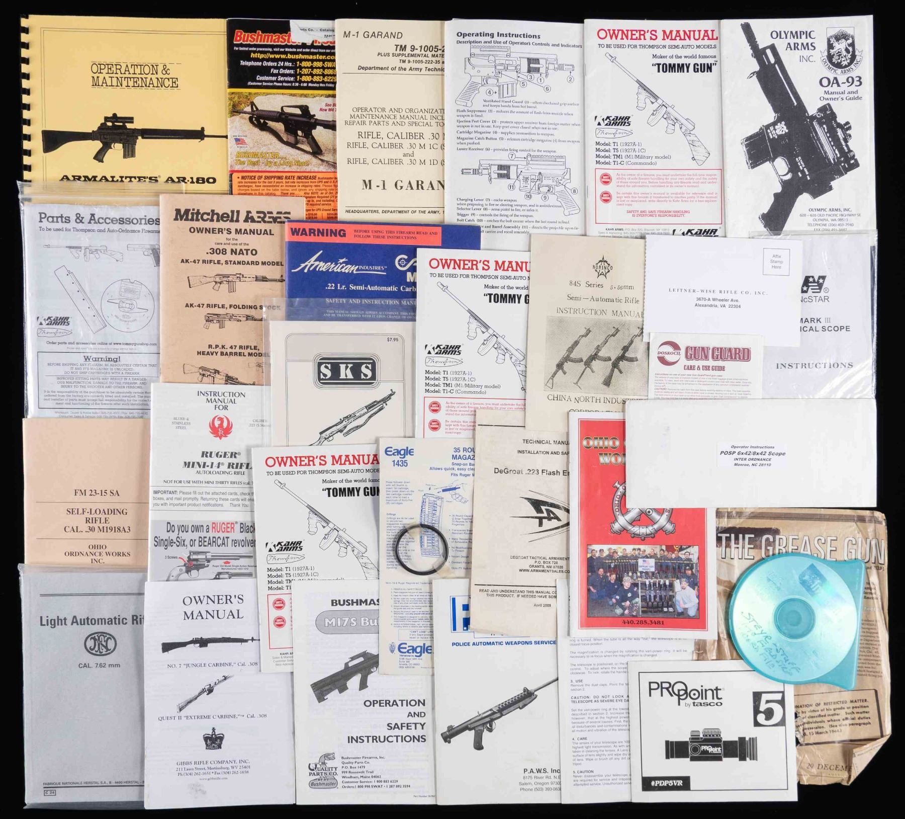 Lot of assorted firearms manuals and catalogs, including: 1) Armalite AR-180 operation and maintenance manual. 2) Bushmaster M17S Bullpup manual. 3) x3 Kahr Arms Thompson (semi-automatic models) manuals. 4) Calico M100 manual. 5) SKS instruction and maintenance manual. 6) Bushmaster Firearms catalog. 7) Ruger Mini-14 manual. 8) 1969 reprint of the Army's M1 Garand TM 9-1005-222-12 manual. 9) Gibbs rifle Company No. 7 Jungle Carbine and Quest II "EXTREME CARBINE" manual pamphlet. 10) Olympic Arms AR-15 instructional paperwork. 11) FN "Light Automatic Rifle" (FAL) manual. 12) Kahr Arms Parts & Accessories paperwork. 13) Ohio Ordnance Works FM 23-15SA 1918A3 BAR manual. 14) Norinco 84S Series manual. 15) Olympia Arms Model OA-93 manual. 16) Mitchell Arms .308 NATO AK manual. 17) Ohio Ordnance Works Spring 2006 catalog pamphlet. 18) P.A.W.S. rifle manual. 19) Rifle accessory manuals and assorted paperwork. CONDITION: paperwork shows varying degrees of wear, with most remaining sturdy and serviceable. (02-24538-6/MLW). NON-GUN. $50-100.