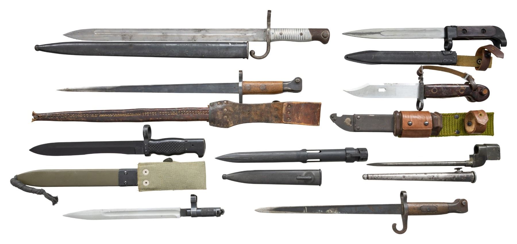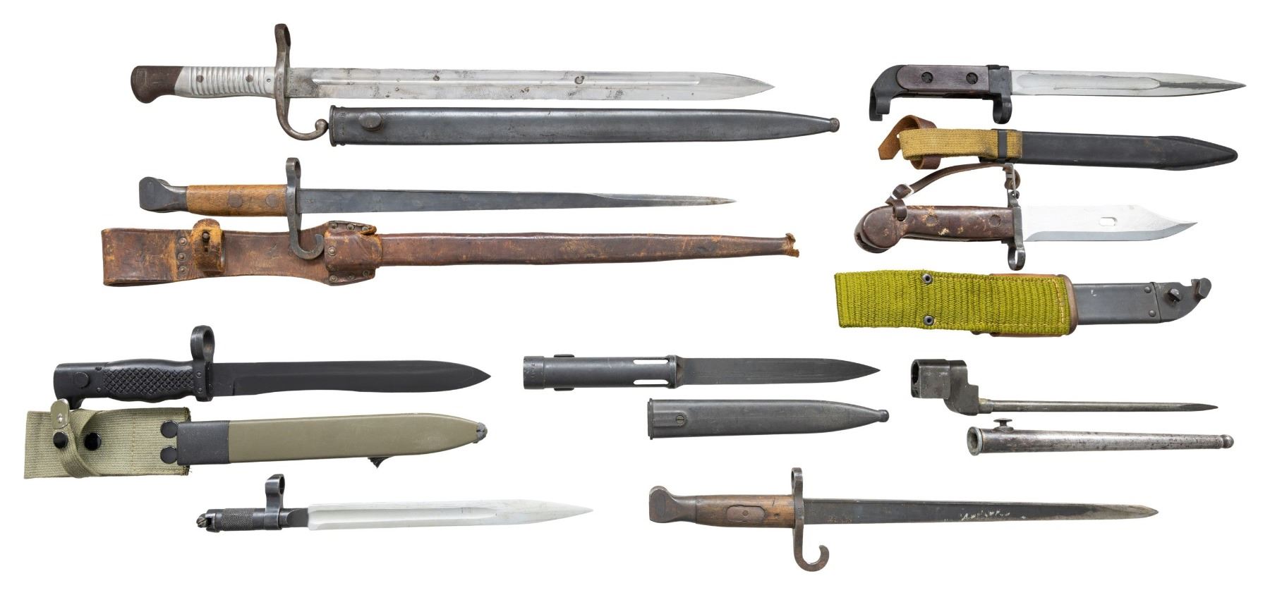 Lot of assorted foreign military bayonets, including: 1) Dutch Model 1895 Mannlicher Artillery bayonet mfg. under contract in Austria by OEWG (Austrian Weapons Factory Company, later renamed to "Steyr-Werke AG"). T-back blade measures 14" with an overall length of 18 13/16". Right side of the ricasso is marked with a Crown/T proof, with an OE/ WG" mfg. marking on the left. Hooked quillon guard with unique pommel contour. Metal components exhibit a blue finish overall. Plain wood 2-piece grip scales. UNATTACHED ACCESSORIES: proper brown leather scabbard marked "CW" over a horizontal "18" on the front and "4236" on the rear. CONDITION: blade is very good, retaining the majority of its arsenal blue finish, showing some light wear and spots of light surface oxidation. Quillon and pommel exhibit scattered spots of mild surface oxidation. Scabbard remains malleable, exhibiting age related cracking and crazing, with a tear towards the throat and losses to the stitching at the tip. 2) Dutch Model 1895 Mannlicher Marines bayonet. T-back blade measures 11 3/16" with an overall length of 16". Right side of ricasso is marked with a Crown/E proof, with an "OE/ WG" mfg. marking on the left. Hooked quillon guard with unique pommel contour. 2-piece wood grip scales with Marine pattern screw and fastening plate. CONDITION: metal components retain large amounts of their arsenal blue finish, showing some wear and thinning, with light to mild surface oxidation present overall. Blade shows striations from prior sharpening. 3) Argentine Model 1891 bayonet. Blade measures 15 3/4" with an overall length of 20 1/2". Argentine crest on right side of ricasso has been ground. Left side of the ricasso is marked "WEYERSBURG/ KIRSCHBAUM & CO/ SOLINGEN". In-the-white quillon crossguard and pommel with 2-piece grooved alloy handle. UNATTACHED ACCESSORIES: matching blued steel scabbard. CONDITION: blade is good, retaining a mostly bright appearance, with scattered spots of light pitting and age related discoloration. Guard and pommel have faded to a dark gray patina. Guard shows some light pitting, with the pommel exhibiting consistent light to mild pitting. Alloy grips are very good, with some scattered marks and minor impressions. Scabbard retains the majority of its blue finish, showing scattered spots of light to mild surface oxidation. 4) Spanish CETME bayonet. Blade measures 8 3/4" with an overall length of 13 1/4". Blade, guard/bayonet ring, and pommel exhibit a matte black finish. 1-piece flat checkered black polymer grip. UNATTACHED ACCESSORIES: green plastic scabbard with matte black finished steel throat and green canvas belt hanger. CONDITION: metal components are very good, showing some light wear with scattered superficial handling marks overall. Grip and scabbard show scattered handling marks, but otherwise remain sound. 5) Belgian FAL tubular bayonet. Blade measures 6 11/16" with an overall length of 11 7/16". Steel construction with matte black enamel type finish. UNATTACHED ACCESSORIES: black polymer scabbard. CONDITION: good, with scattered handling marks, as well as some light wear and flaking overall. 6) Russian AK-47 bayonet mfg. at the Izhevsk Mechanical Plant between 1955-1960. Blade measures 8" with an overall length of 12 5/16". Right side of guard/bayonet ring is marked with the Izhevsk arsenal insignia. Blade features a matte gray finish, with the guard and pommel exhibiting a dull blue finish. 2-piece plain mottled brown synthetic grip scales. UNATTACHED ACCESSORIES: proper matte black finished steel scabbard with drain hole and canvas belt loop. CONDITION: blade shows wear to its matte gray finish in contact areas with scabbard. Guard and pommel are very good, with light surface oxidation. Scabbard is very good, with light handling marks. 7) Likely Romanian mfg. 6X3 AKM pattern bayonet. Blade (with serrated spine) measures 5 13/16" with an overall length of 10 7/8". Blued steel crossguard with 2-piece dark mottled brown synthetic handle. UNATTACHED ACCESSORIES: parkerized steel scabbard with nylon and leather fittings, as well as a brown rubber insulator. CONDITION: blade is very good, with some light scratches and age related discoloration. Handle shows some scattered handling marks, but it otherwise sound. Scabbard shows some light wear overall. 8) SKS blade pattern bayonet. Blade measures 8 15/16" with an overall length of 12 1/4". Blade exhibits a matte gray finish, with the remainder exhibiting a blue finish. Attachment screw is present. CONDITION: blade shows some scattered superficial handling marks, but is otherwise good overall. 9) British No. 4 Mk II spike bayonet. Blade measures 7 7/16" with an overall length of 9 13/16". Mfg. markings on left side are mostly illegible. Blue finish. UNATTACHED ACCESSORIES: steel scabbard. CONDITION: bayonet shows overall wear that is fading to gray patina, but otherwise remains sound. Scabbard exhibits a mostly gray patina with small impressions and light pitting. Throat pin on scabbard is absent. (02-25302/MLW). NON-GUN. $200-400.