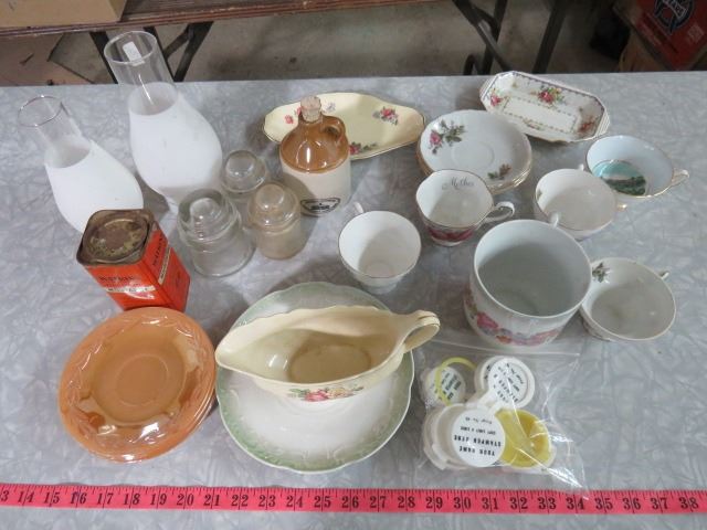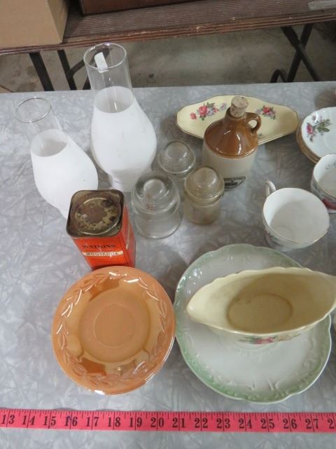 LOT OF ASSORTED GLASSWARE INCLUDING 5 FIRE KING SAUCERS, 3 INSULATORS, SMALL REPLICA JUG, ETC.