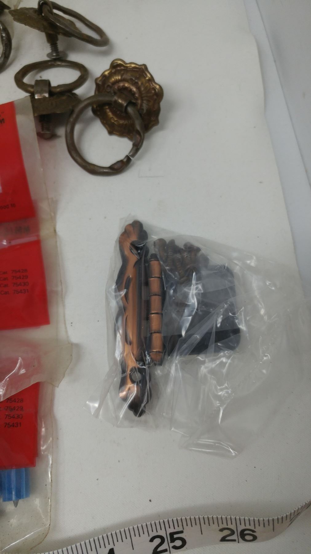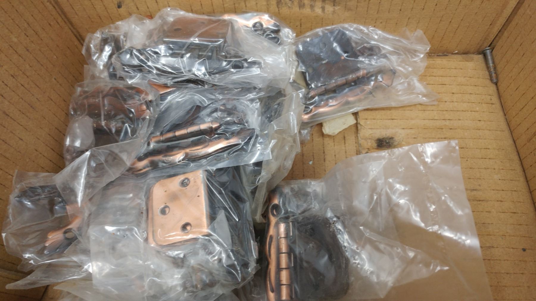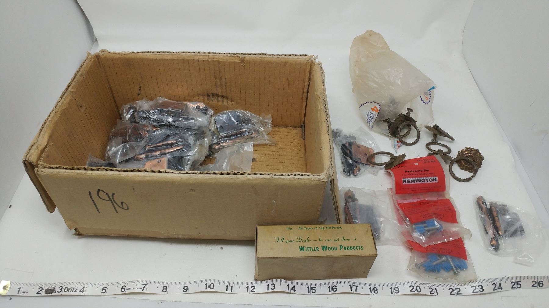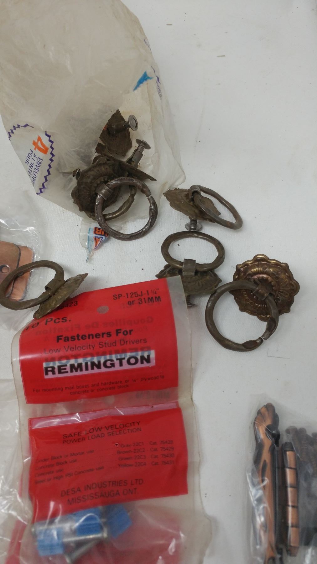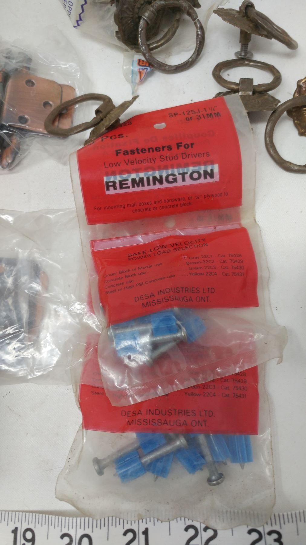 LOT OF ASSORTED HINGES, DRAWER PULLS, STUD DRIVERS, ETC.